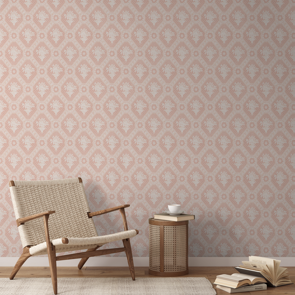 Elegant vintage floral damask pattern in soft blush pink and cream, featuring decorative frames and delicate bouquet motifs - perfect for creating a romantic, heritage-inspired atmosphere.