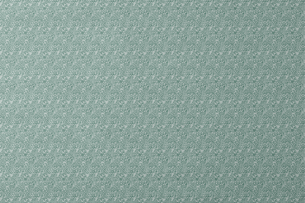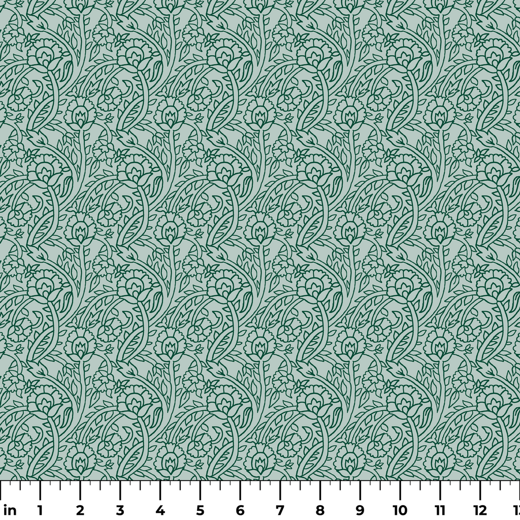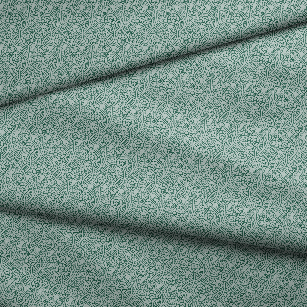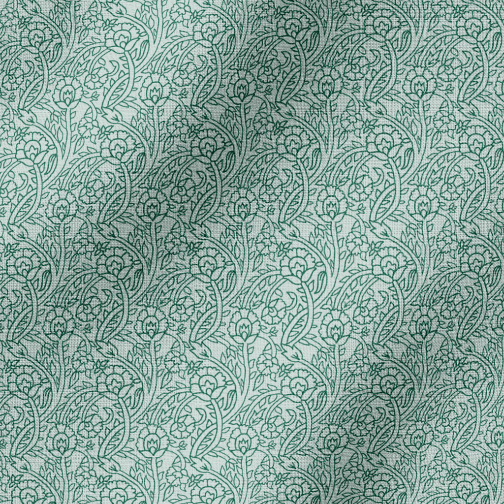 Elegant forest green floral pattern with swirling vines and blooms in a traditional style. This botanical motif features curving stems and detailed flowers on a soft mint background.