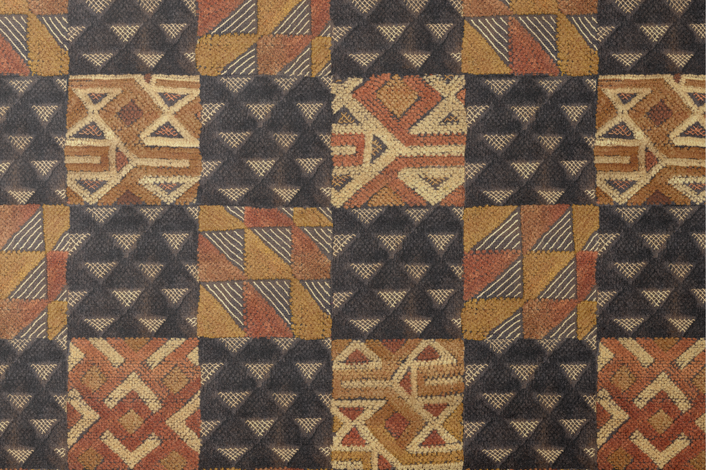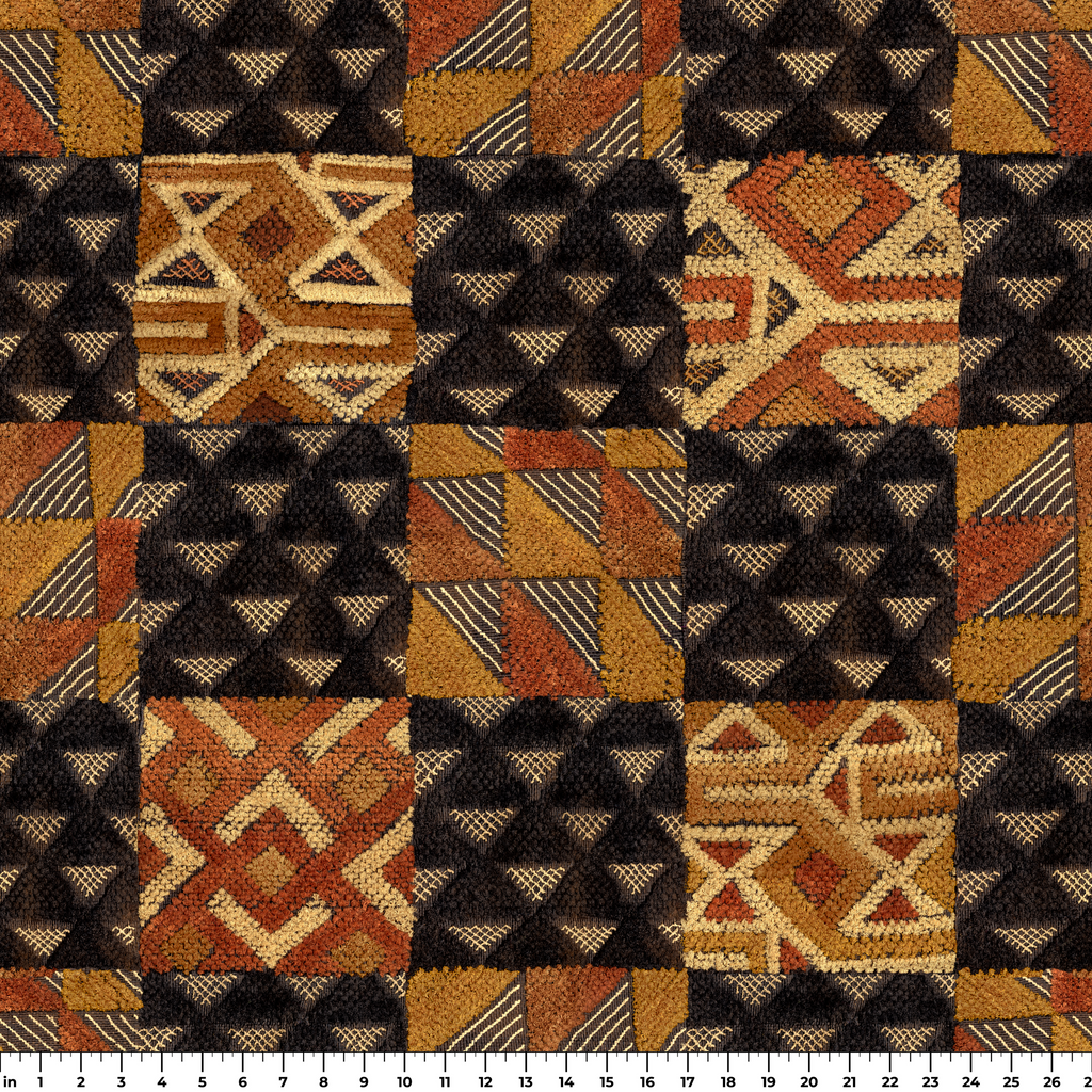 This authentic African- inspired design showcases geometric patterns in a checkerboard layout of brown, black, and orange. Traditional tribal motifs alternate with triangular designs, creating a rich, heritage-inspired fabric perfect for cultural accents to any room.
