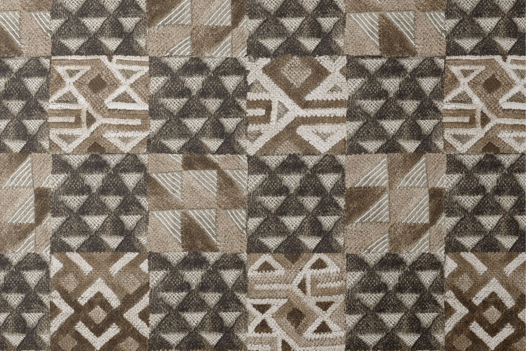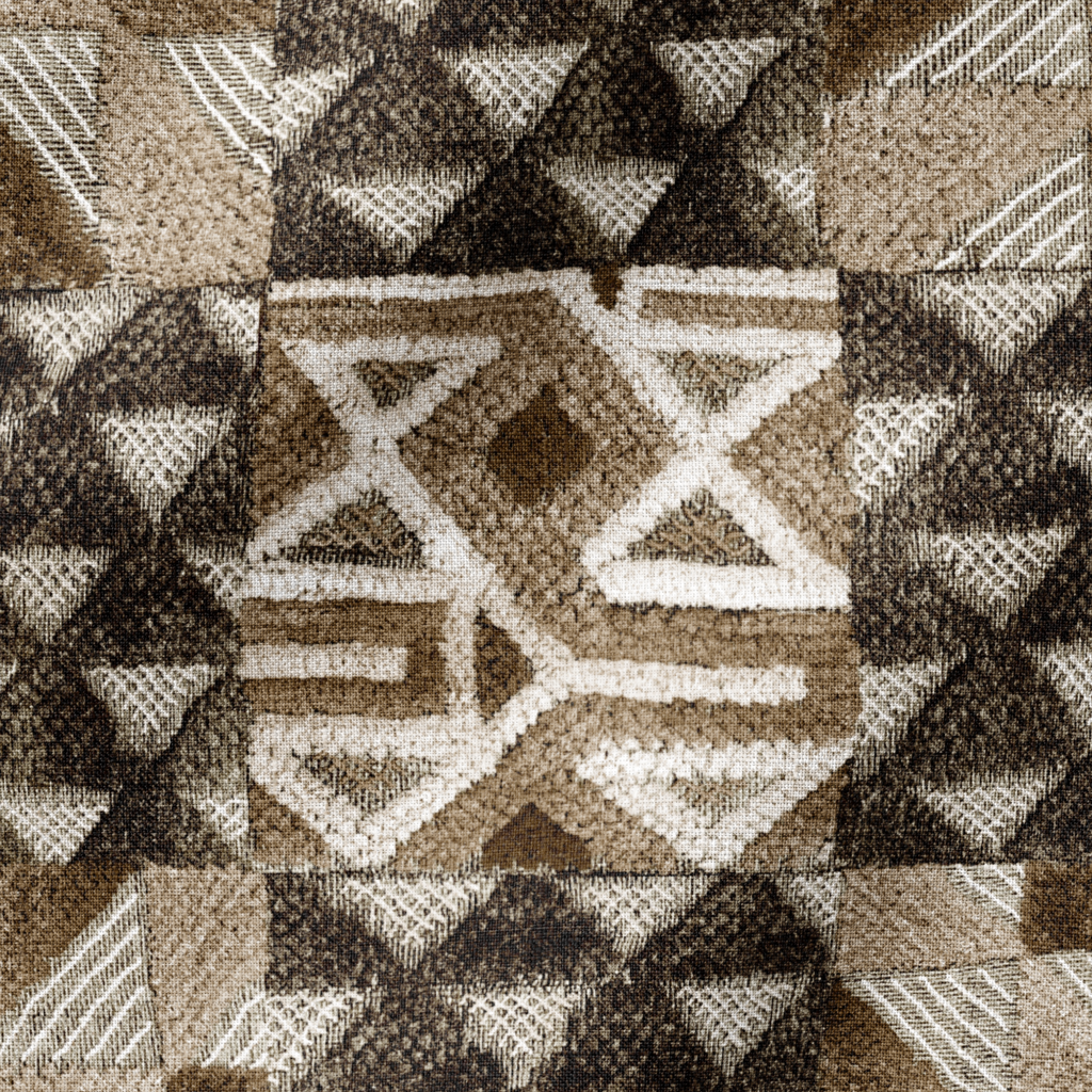 This authentic African - inspired design showcases geometric patterns in a checkerboard layout of brown and cream. Traditional tribal motifs alternate with triangular designs, creating a rich, heritage-inspired fabric perfect for cultural accents to any room.