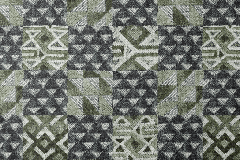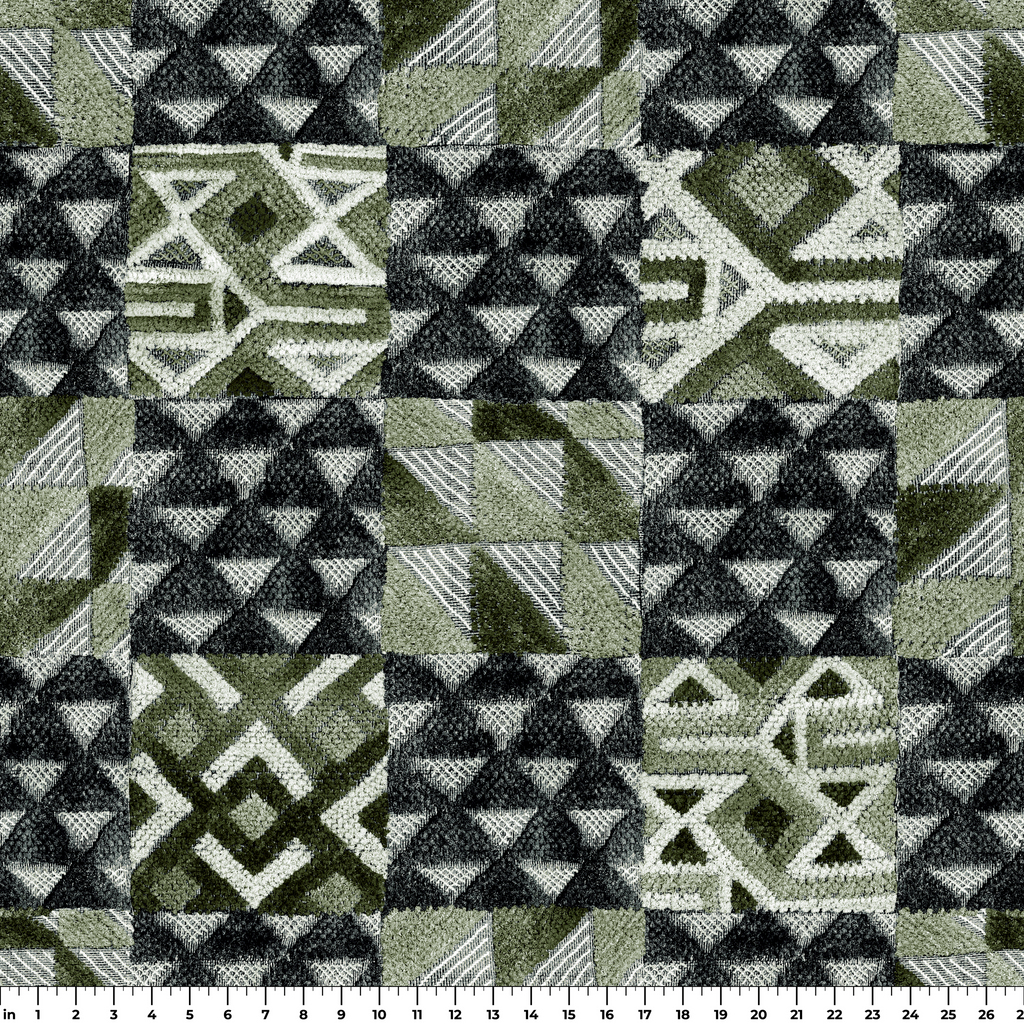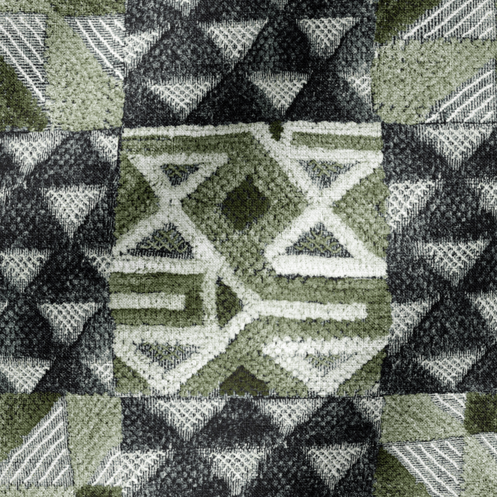 This authentic African - inspired design showcases geometric patterns in a checkerboard layout of green, black, and cream. Traditional tribal motifs alternate with triangular designs, creating a rich, heritage-inspired fabric perfect for cultural accents to any room.