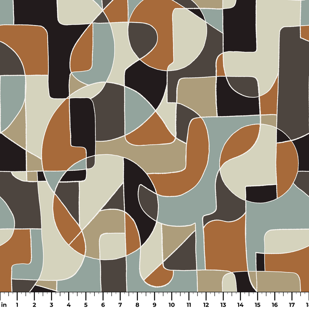 Mid-century modern geometric pattern in warm earth tones with cool blue accents, featuring organic curved shapes and abstract forms perfect for contemporary home decor.