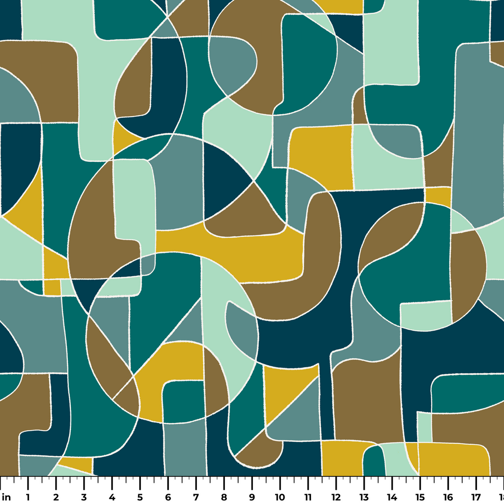 Bold geometric design featuring organic shapes in teal, mustard, brown, and mint creates a mid-century modern pattern with a retro aesthetic perfect for contemporary home decor.