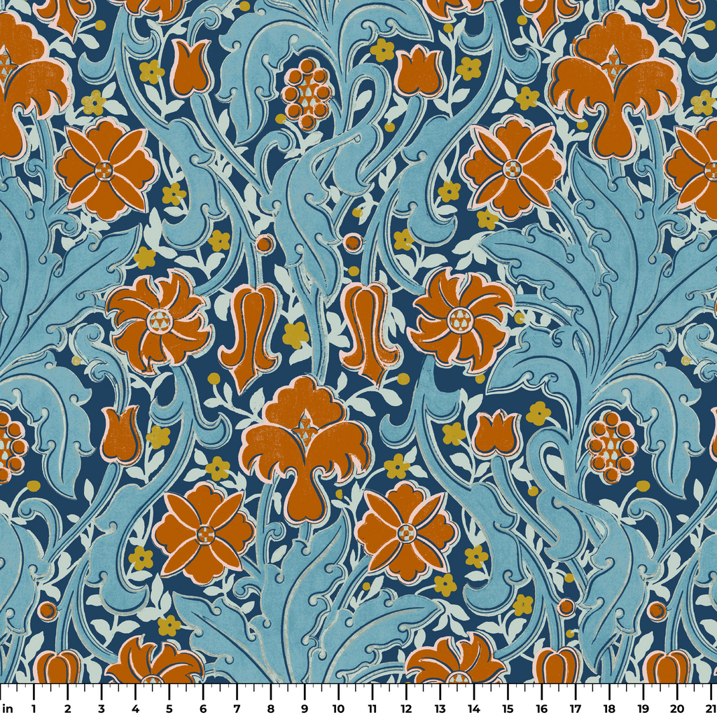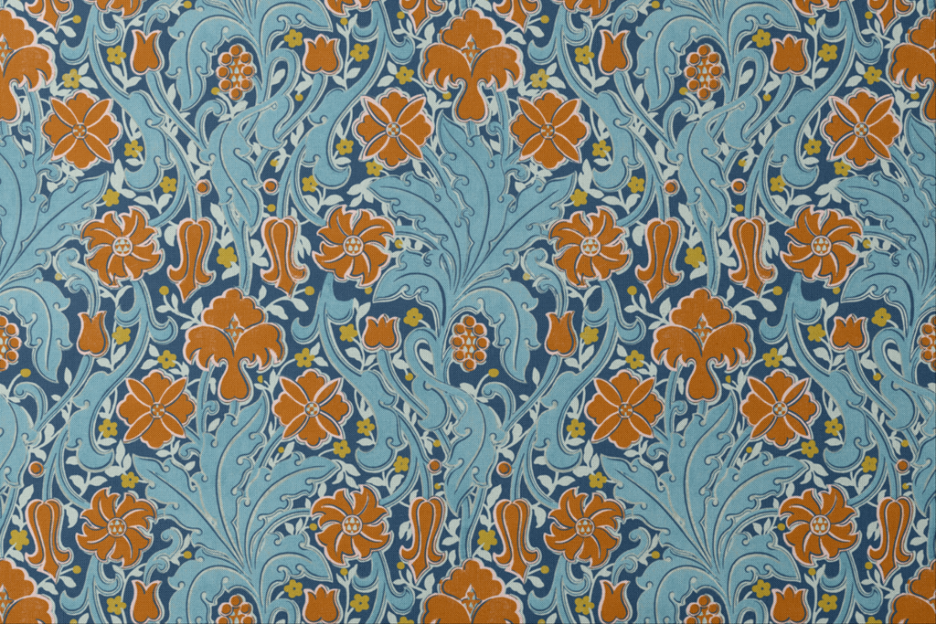 Elegant Art Nouveau floral pattern featuring orange poppies and flowing organic forms on a blue background with a vintage botanical aesthetic.