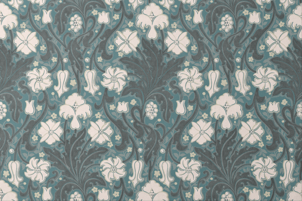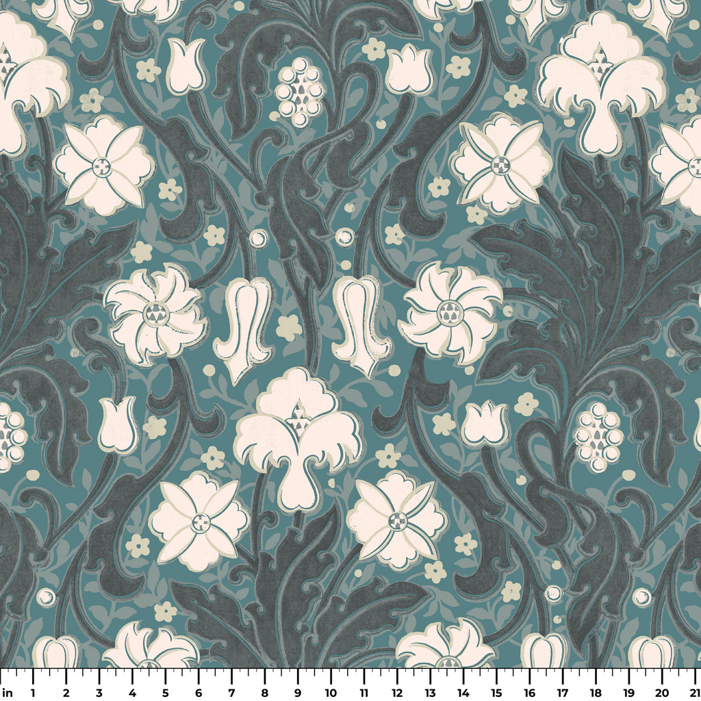 Elegant Art Nouveau floral pattern featuring white poppies and flowing organic forms on a deep teal background with a vintage botanical aesthetic.