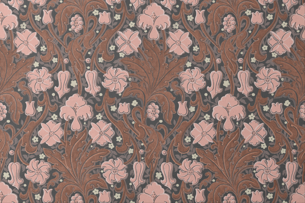 Elegant Art Nouveau floral pattern featuring coral poppies and flowing organic forms on a deep orange background with a vintage botanical aesthetic.