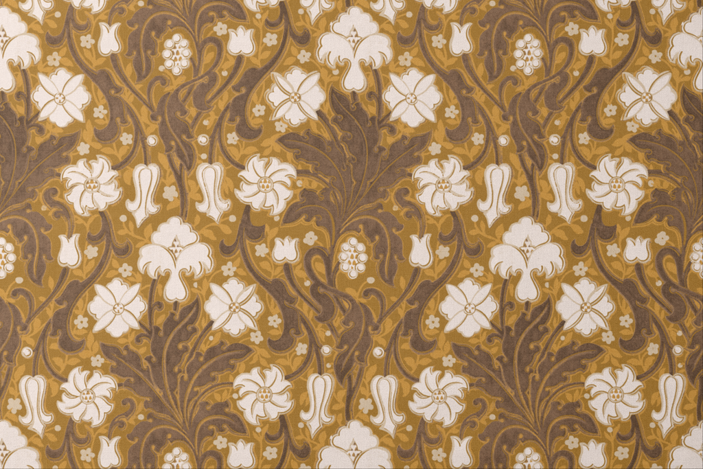 Elegant Art Nouveau floral pattern featuring white poppies and flowing organic forms on a mustard yellow background with a vintage botanical aesthetic.