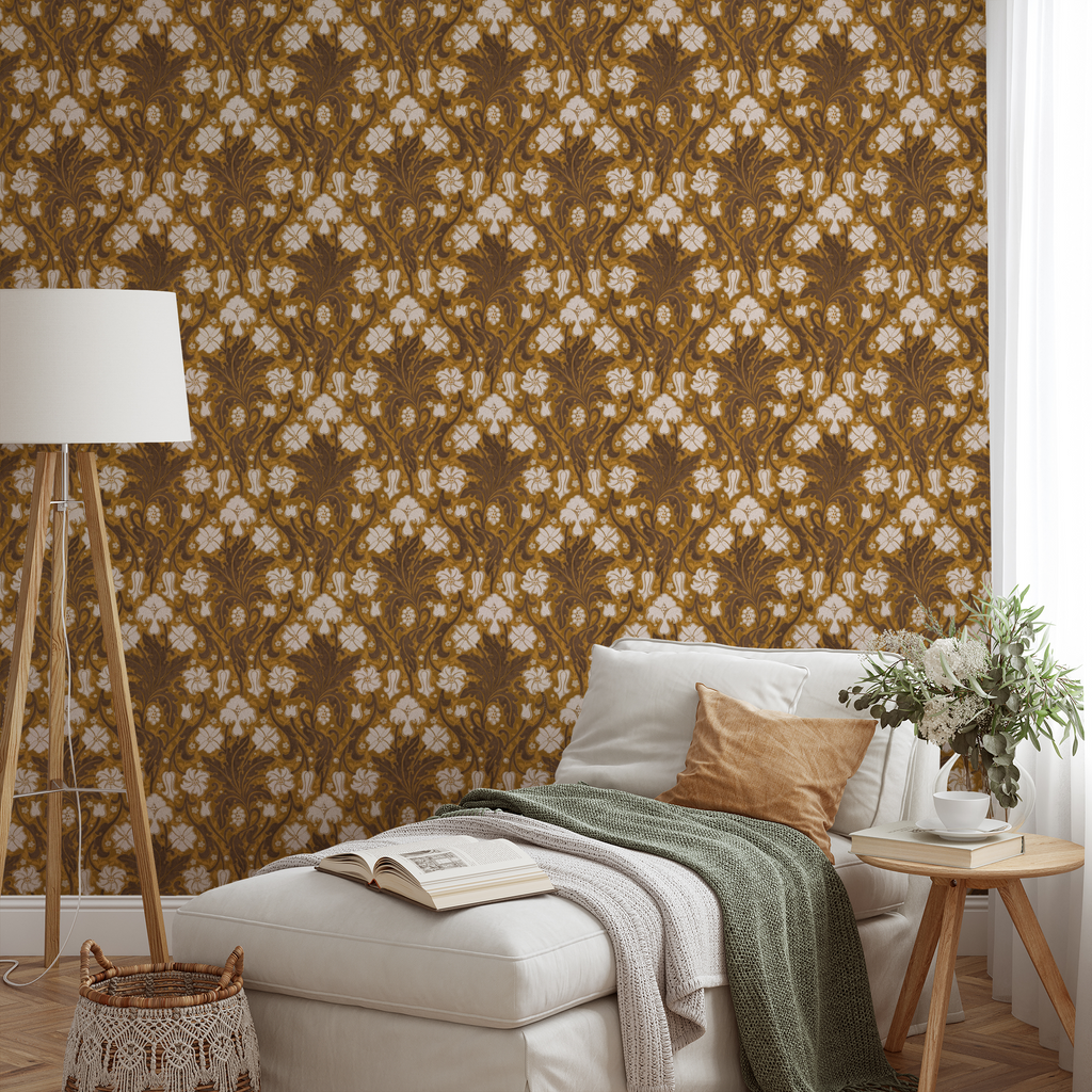 Rich vintage Art Nouveau floral pattern featuring elegant swirling stems and stylized white blooms against a warm golden background. Perfect for heritage home decor with a romantic, traditional aesthetic.