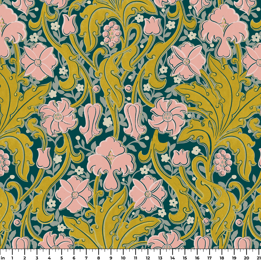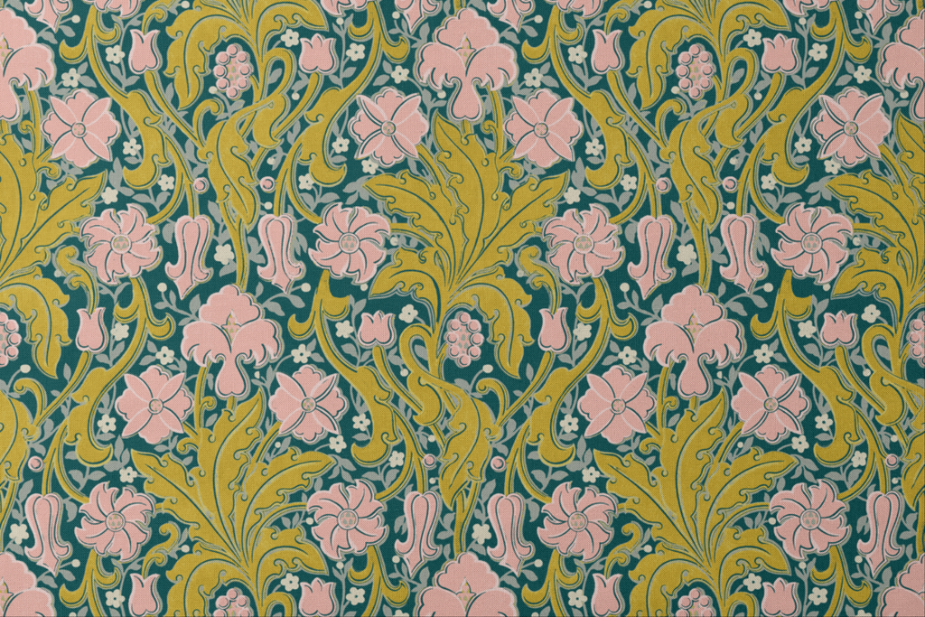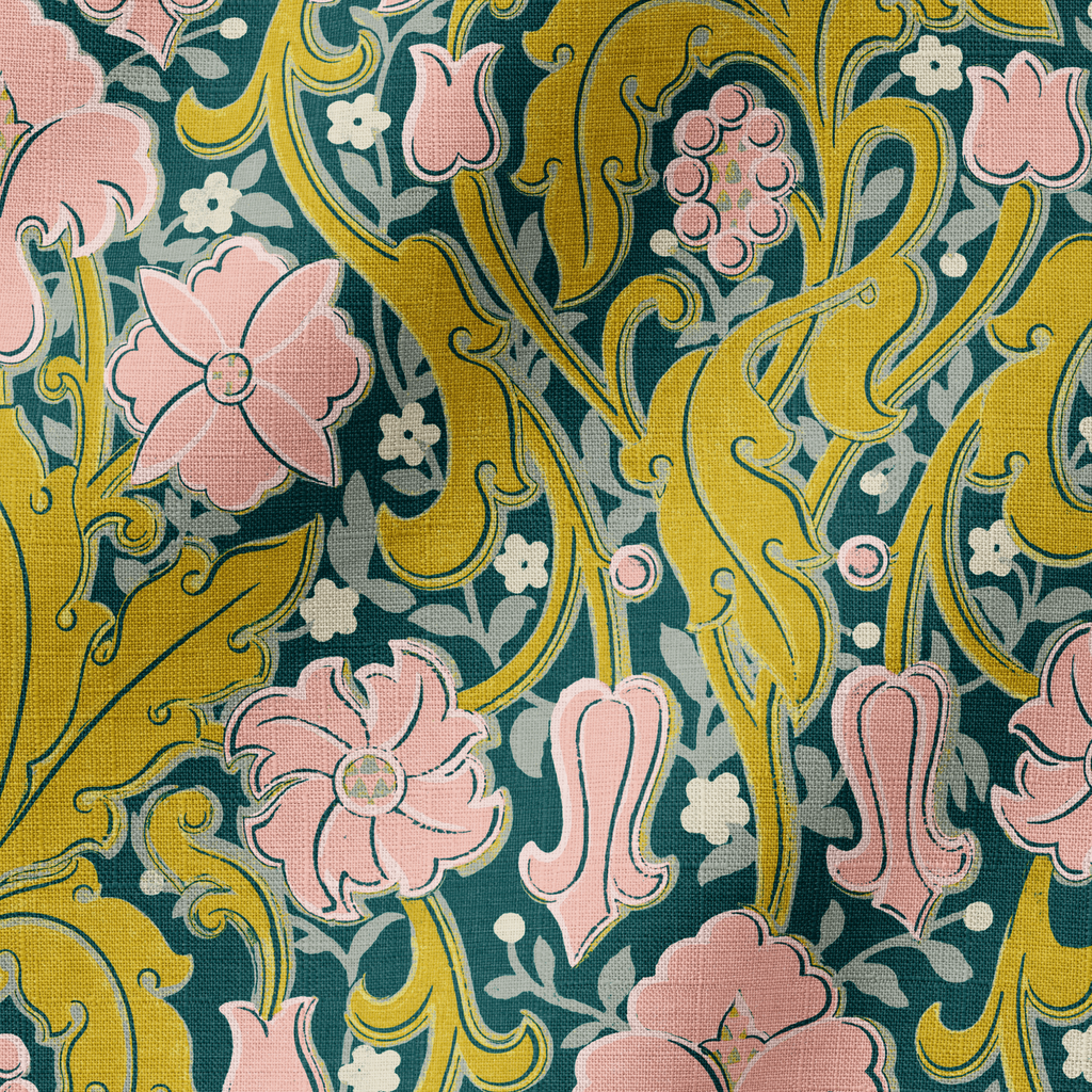 Elegant Art Nouveau floral pattern featuring pink poppies and flowing organic forms on a lime green background with a vintage botanical aesthetic.