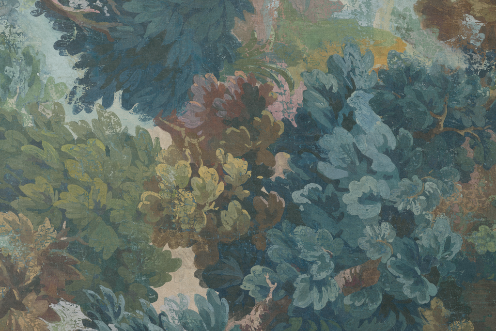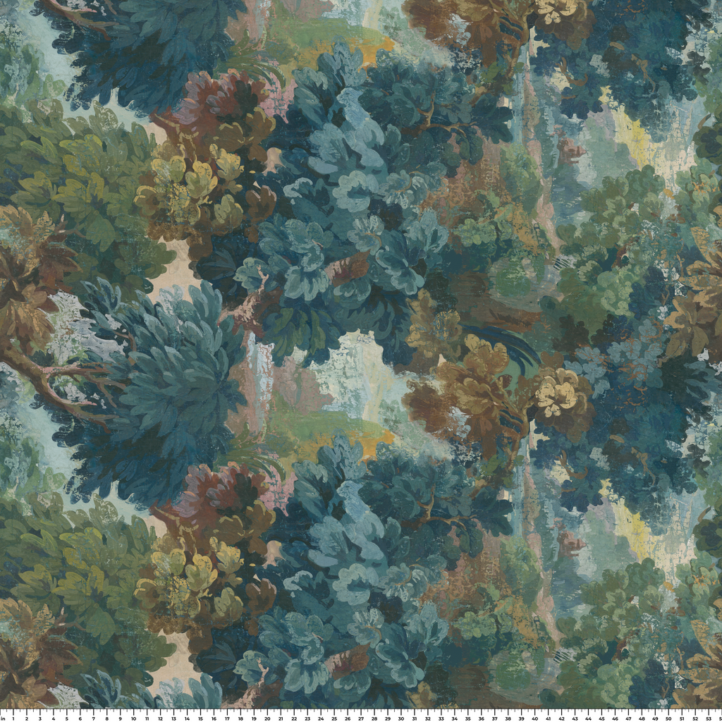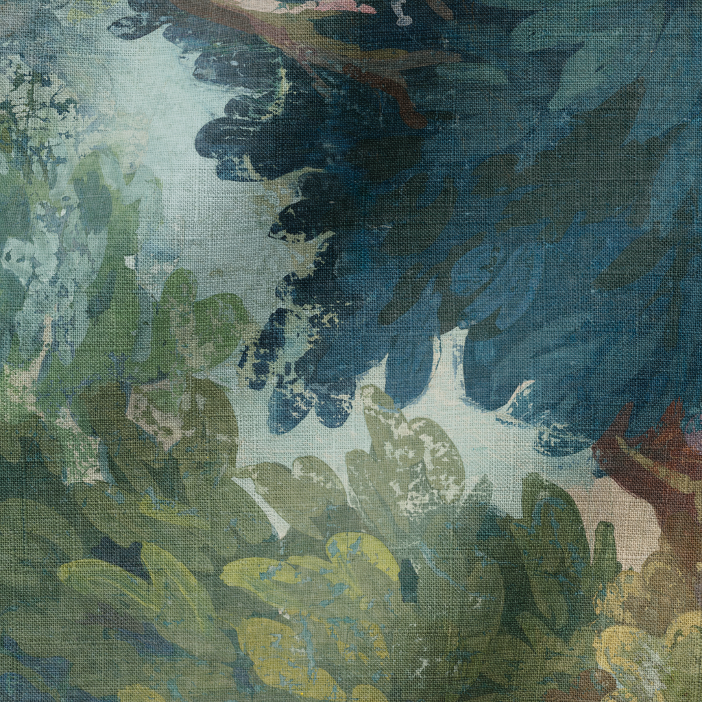 Papel tapiz botánico de lujo con exuberante follaje en tonos de verde azulado, verde bosque y toques de ocre, perfecto para crear un ambiente natural y elegante.