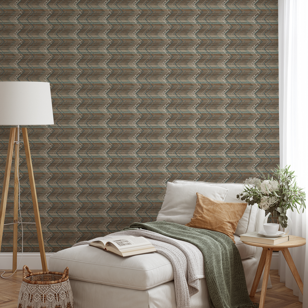 Geometric angular pattern with chevron motifs and linear stripes creating a modern yet retro aesthetic, perfect for contemporary decor.