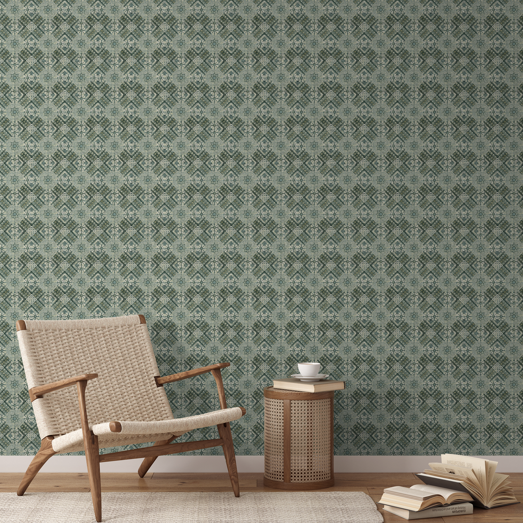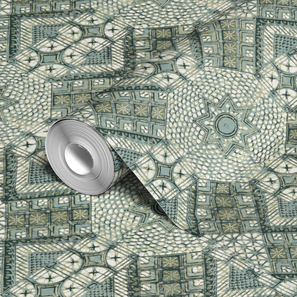 Elegant geometric mosaic pattern in sage green and cream tones featuring intricate medallions and lattice designs with a traditional heritage feel.