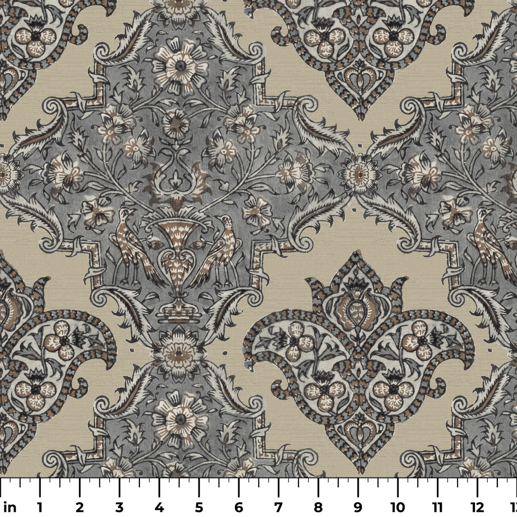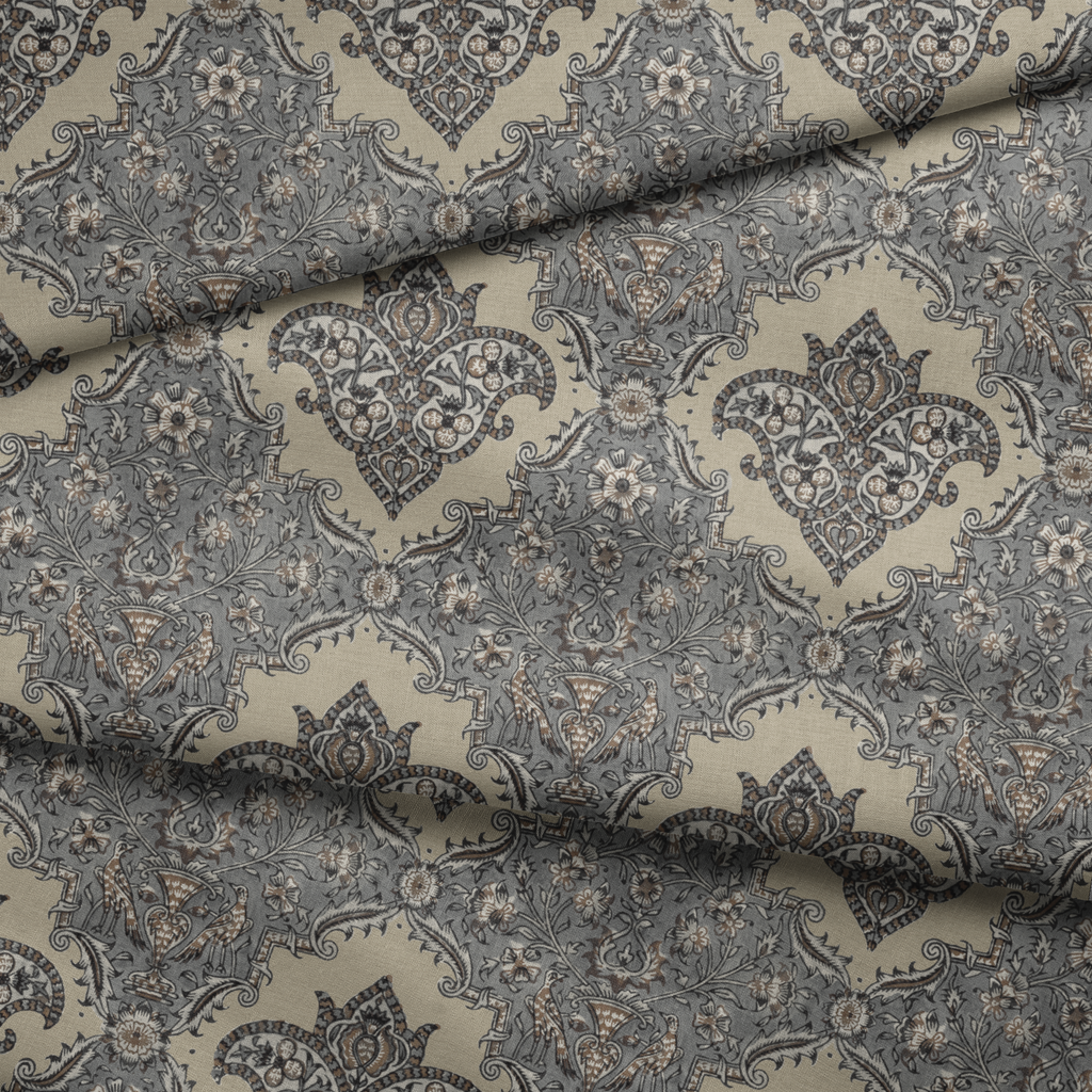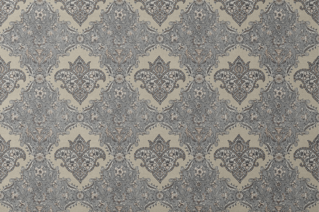 Elegant vintage damask pattern featuring ornate scrollwork and floral motifs in muted beige and grey tones, perfect for Victorian-inspired accents to your space.