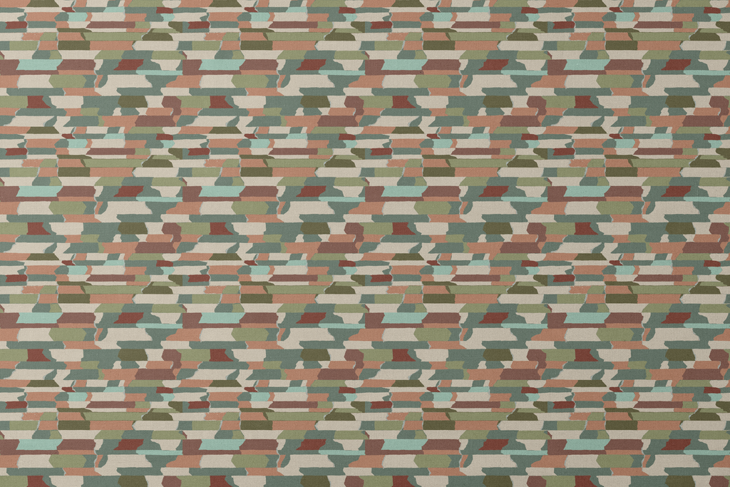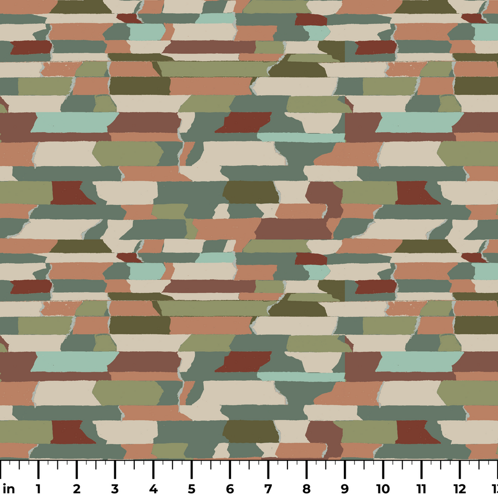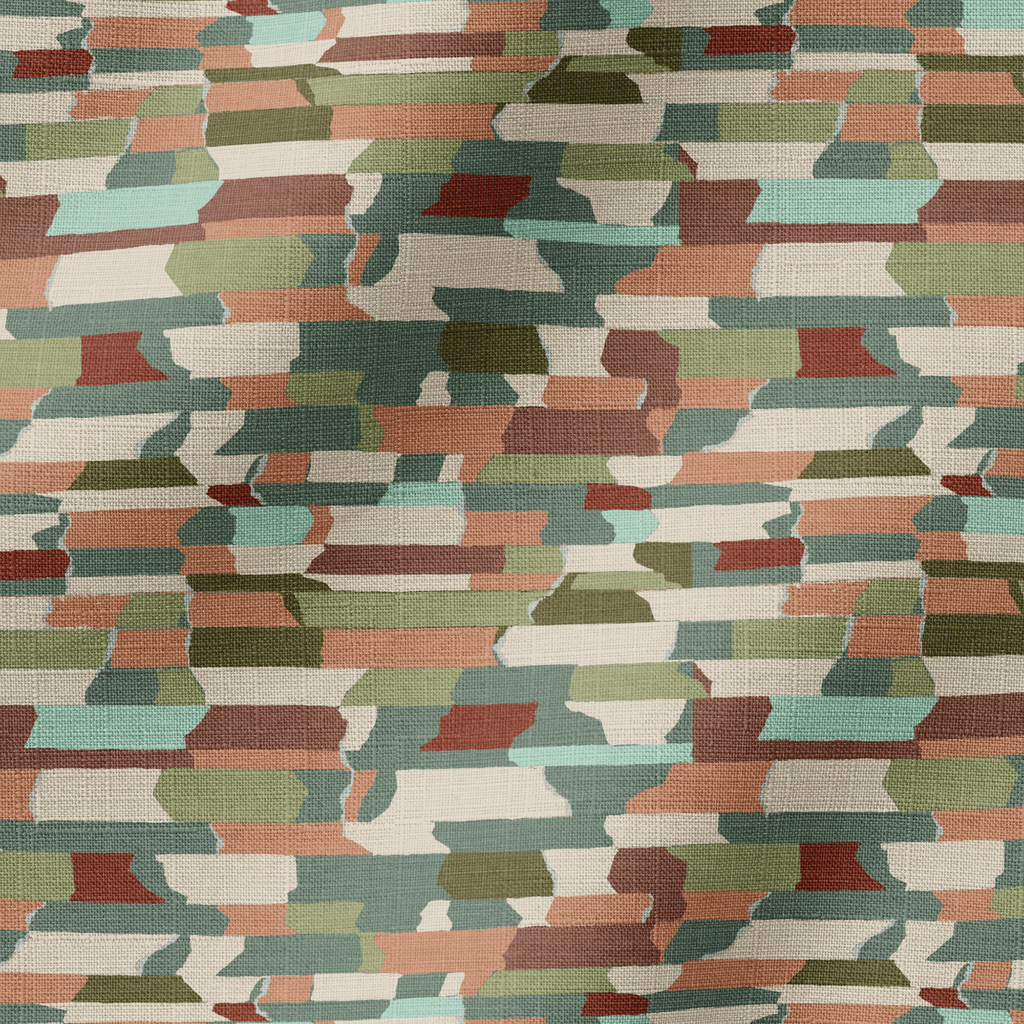 This abstract geometric pattern features muted earth tones in a contemporary arrangement of irregular, horizontal shapes. The soft palette of sage, terracotta, cream and teal creates a modern yet calming aesthetic.