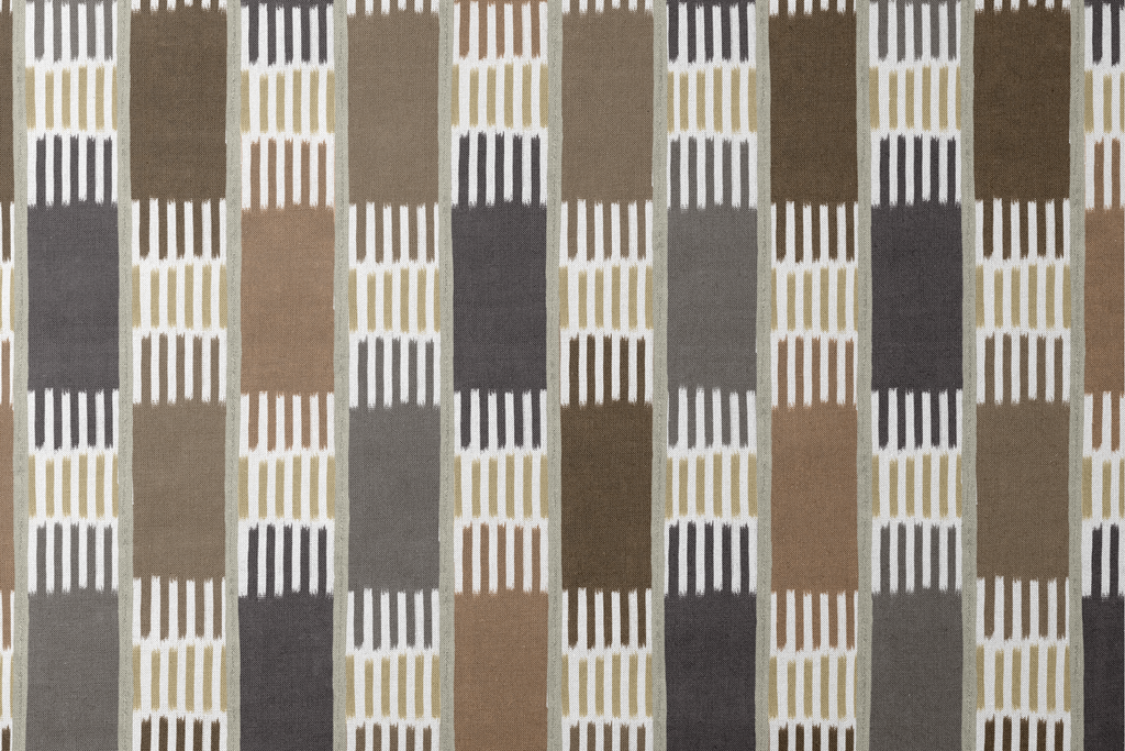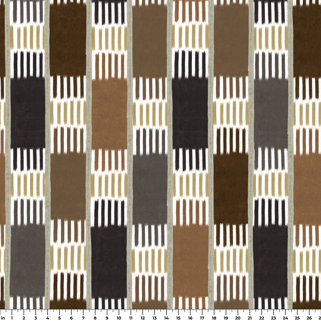 Modern geometric pattern featuring a grid design with rectangles in brown, gray, and black tones. Vertical striped segments create a sophisticated mid-century inspired aesthetic for contemporary home decor.