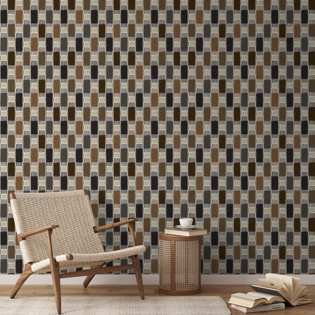 Modern geometric pattern featuring a grid design with rectangles in brown, gray, and black tones. Vertical striped segments create a sophisticated mid-century inspired aesthetic for contemporary home decor.