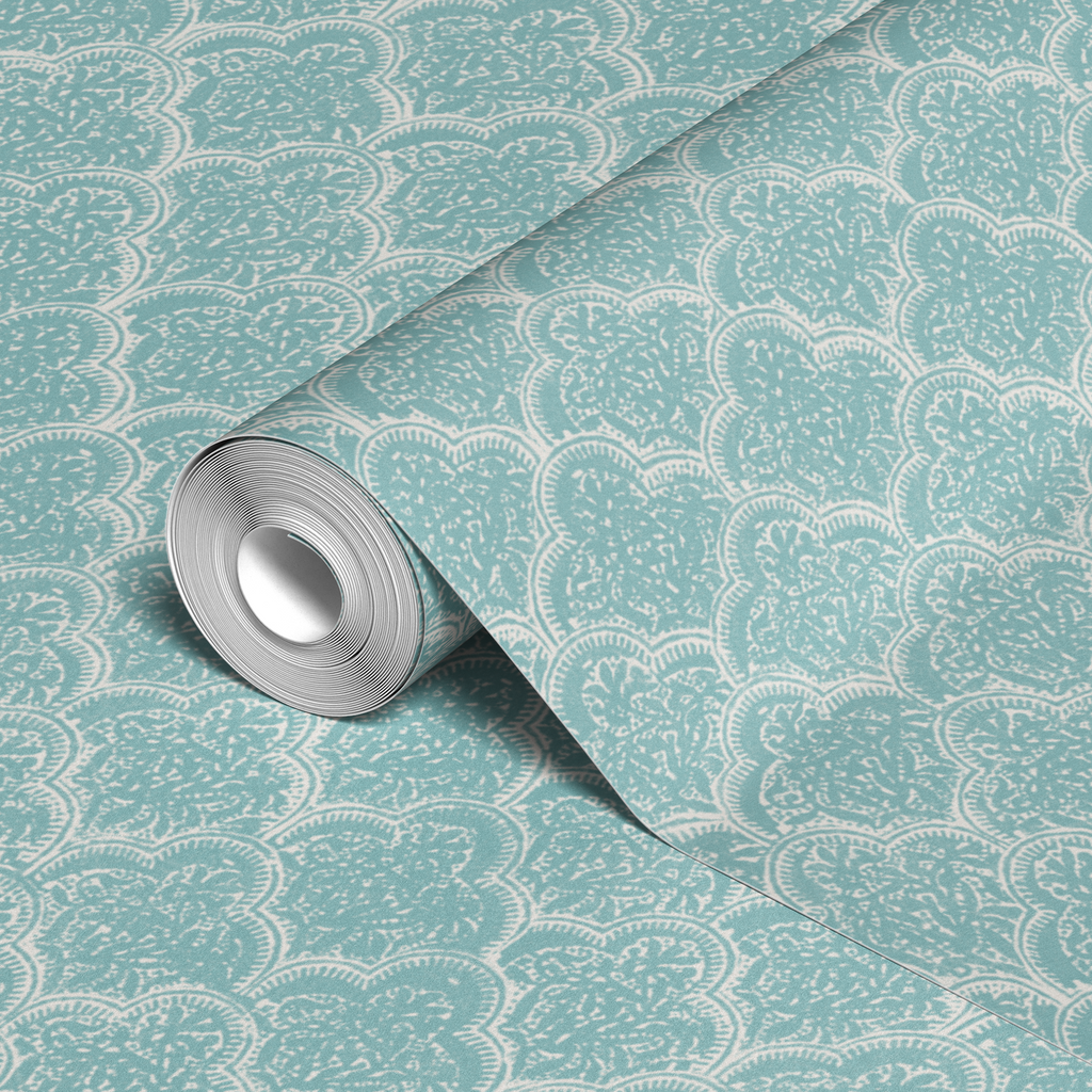 Elegant scalloped pattern fabric with delicate floral details in soft cream and aqua blue tones. Perfect for a traditional aesthetic for any space.