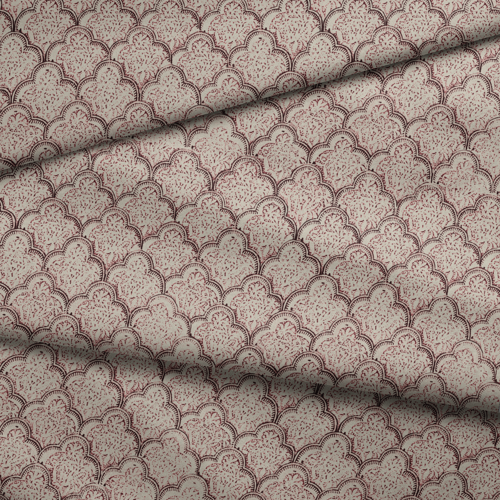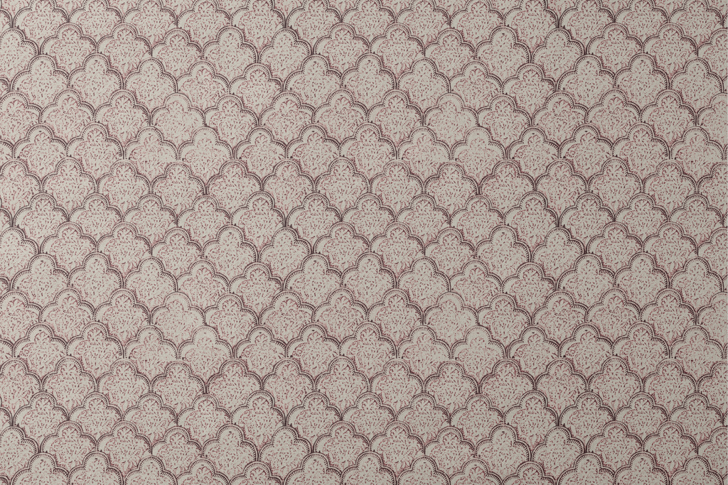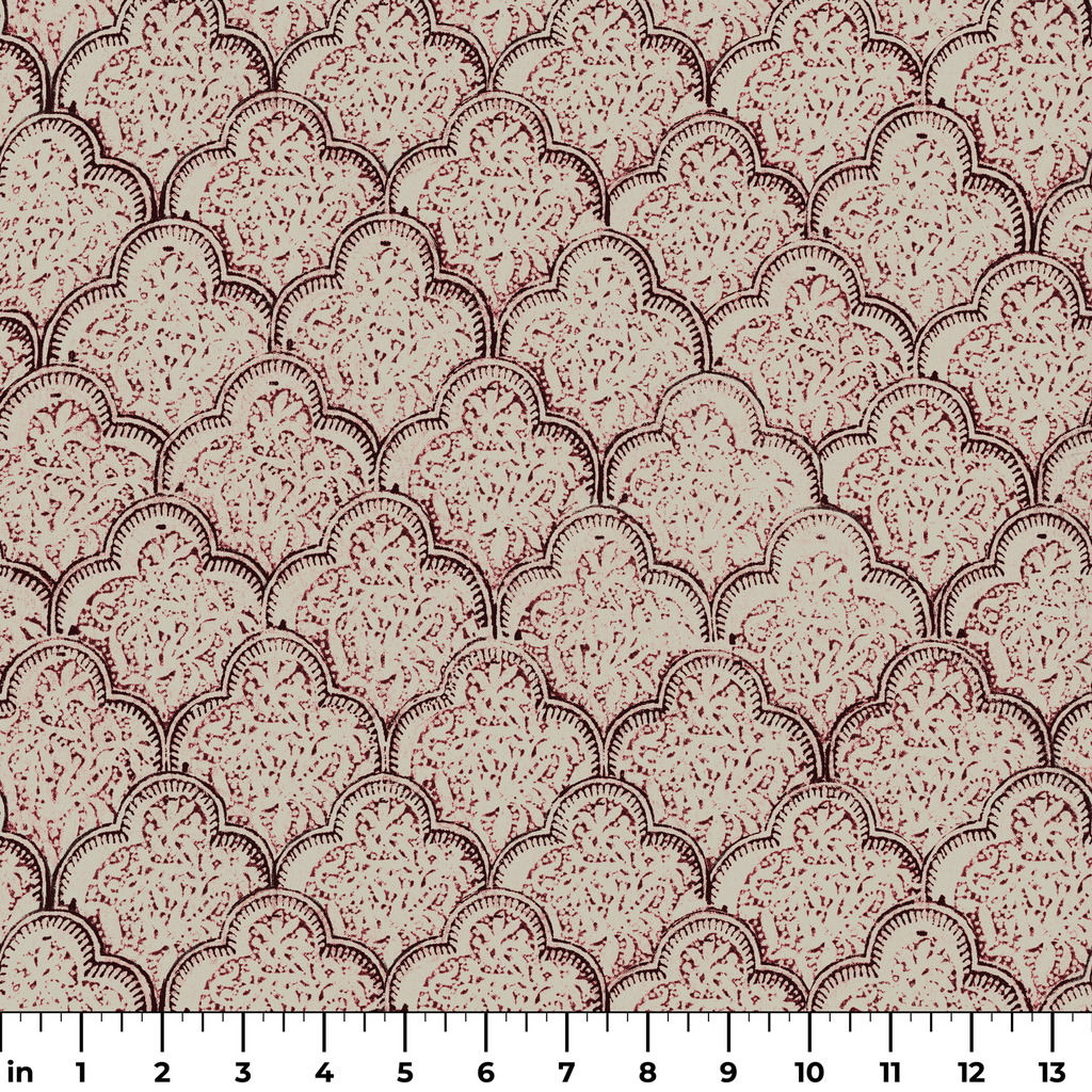 Elegant scalloped pattern fabric with delicate floral details in soft cream and burgundy tones. Perfect for a traditional aesthetic for any space.