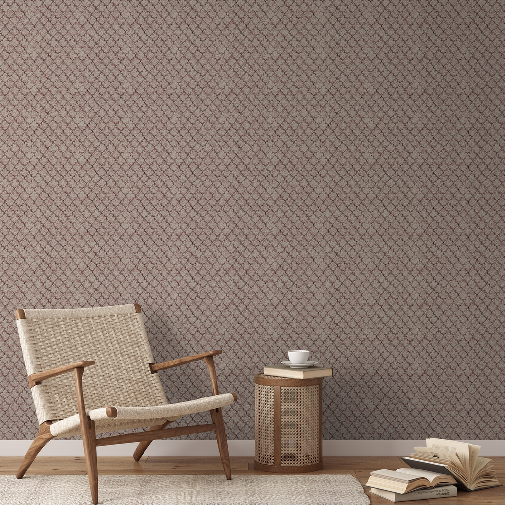 Elegant scalloped pattern fabric with delicate floral details in soft cream and burgundy tones. Perfect for a traditional aesthetic for any space.