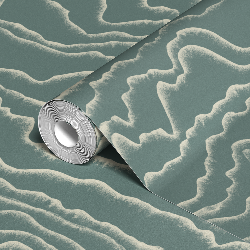 Elegant wavy pattern in muted teal and white tones with organic flowing lines, creating a soothing topographic-inspired design perfect for contemporary home decor or apparel.