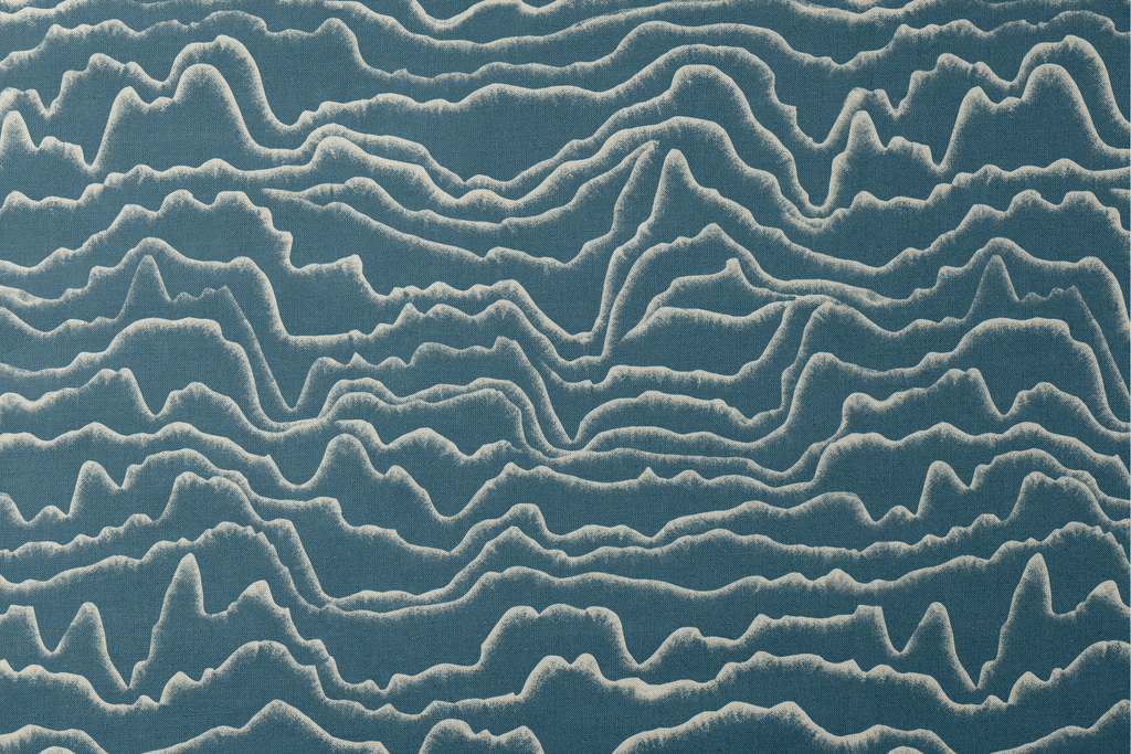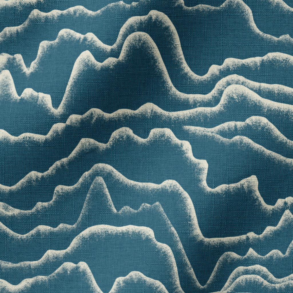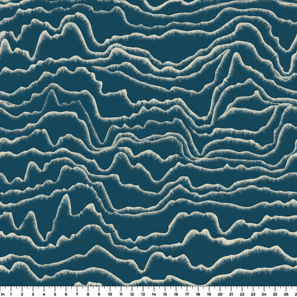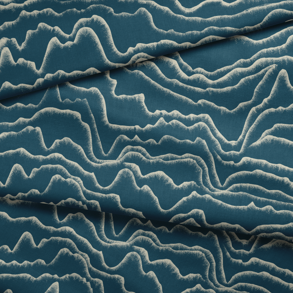Elegant wavy pattern in navy blue and gold tones with organic flowing lines, creating a soothing topographic-inspired design perfect for contemporary home decor or apparel.