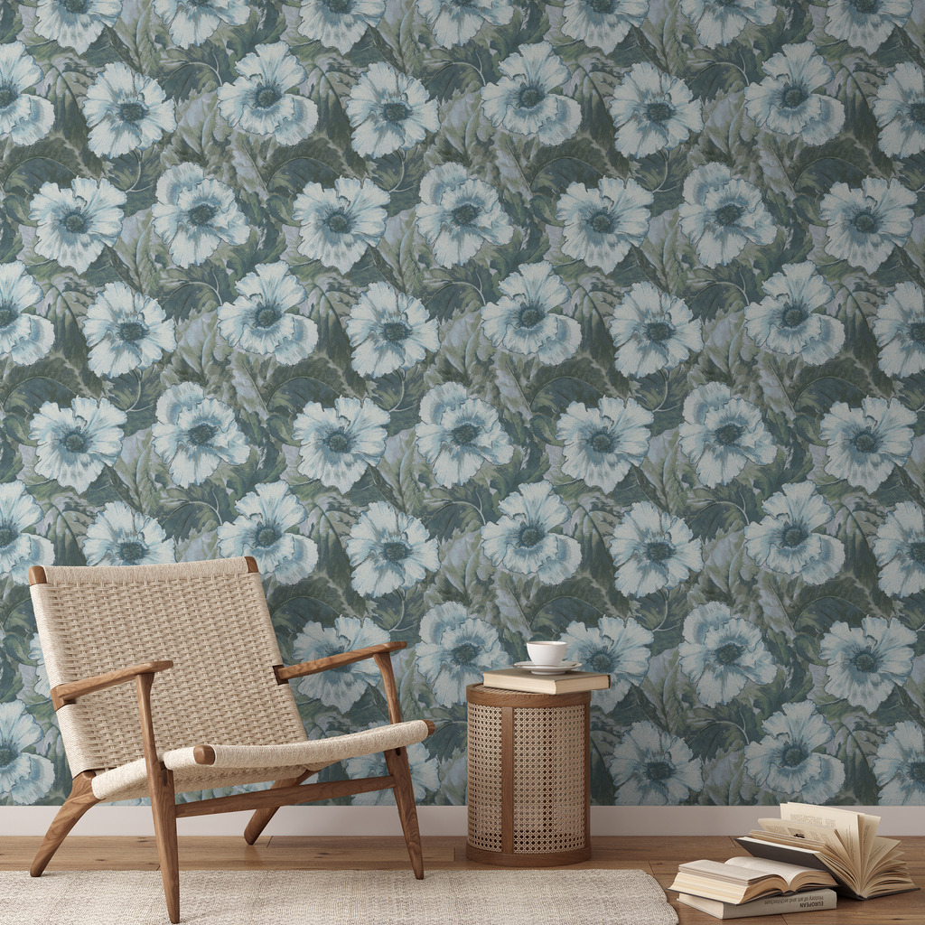 Beautiful watercolor floral pattern featuring delicate white poppies with blue centers against muted sage green leaves, creating an elegant, calming aesthetic for home decor.