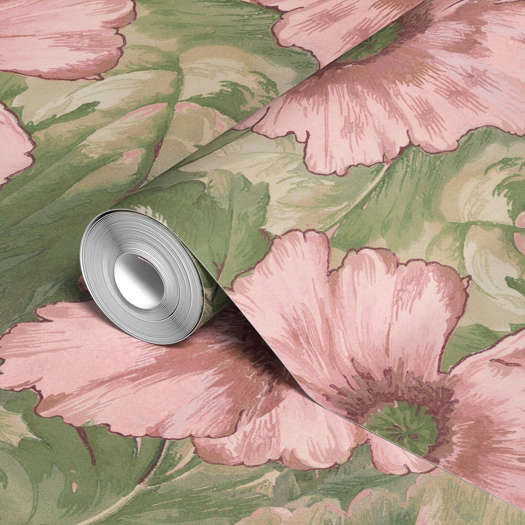 Delicate pink poppies with green stems create a vintage-inspired floral wallpaper pattern in soft, romantic hues perfect for traditional home decor.