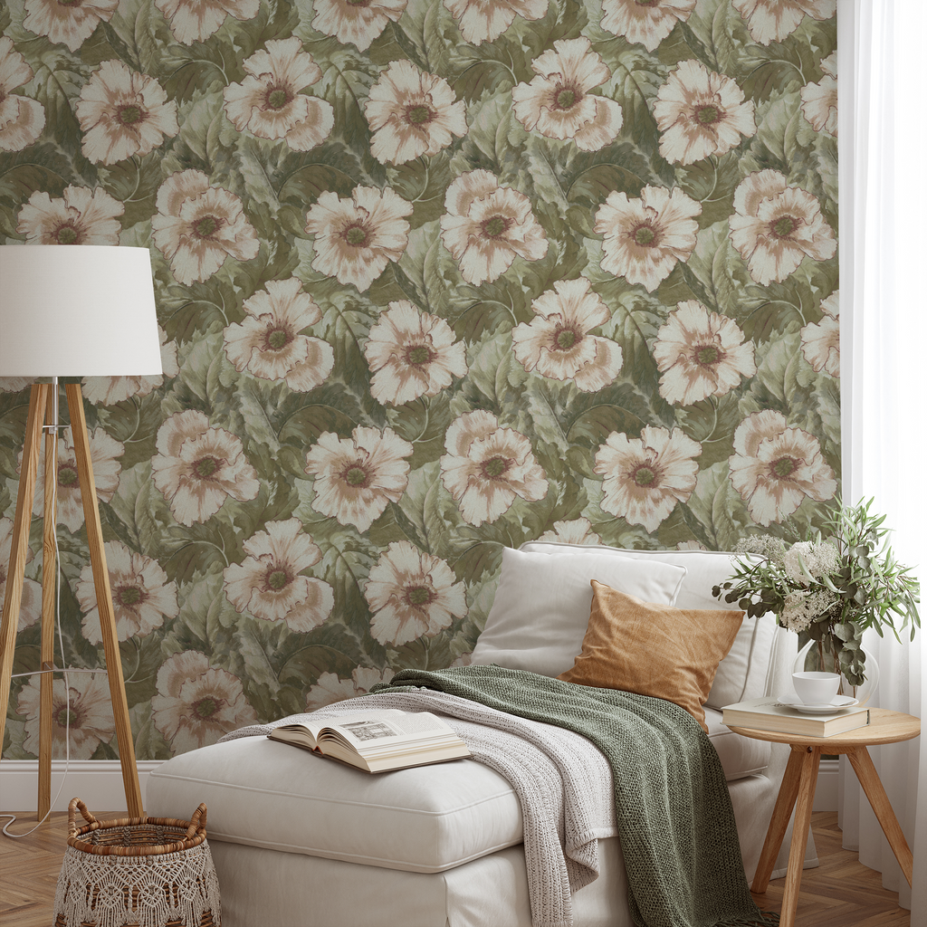 Elegant traditional floral wallpaper pattern featuring cream blossoms with subtle pink accents against muted sage green leaves, creating a timeless vintage garden aesthetic.