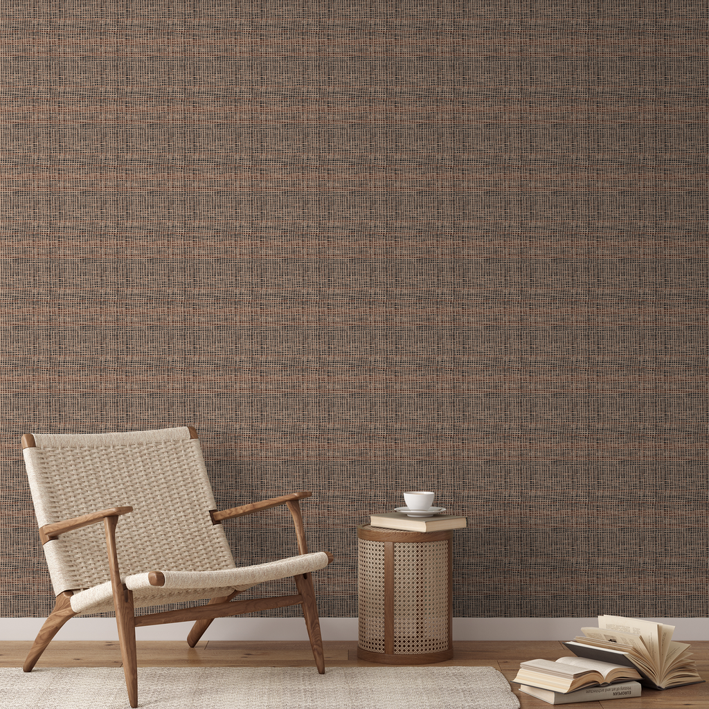 Textured woven fabric with natural beige and brown tones in a rustic geometric grid pattern, creating a handmade, organic feel perfect for bohemian home decor and upholstery applications.