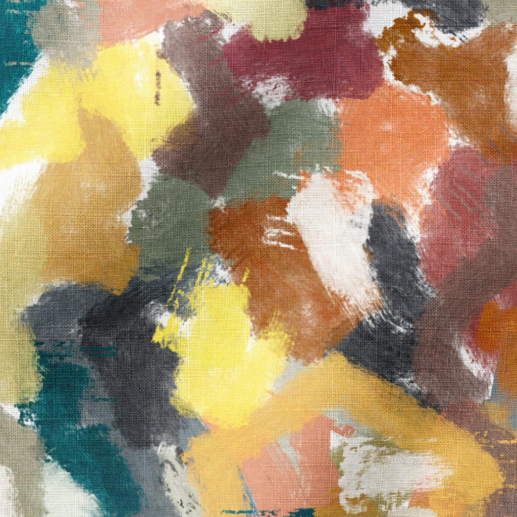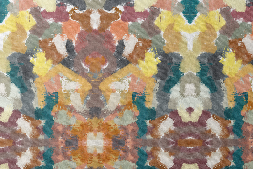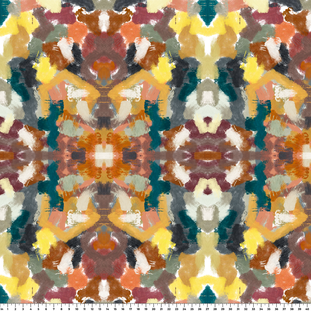 Abstract kaleidoscope-like pattern in yellow, orange, teal, and pink featuring geometric shapes and flowing organic forms. Perfect for any modern home with a contemporary artistic flair.