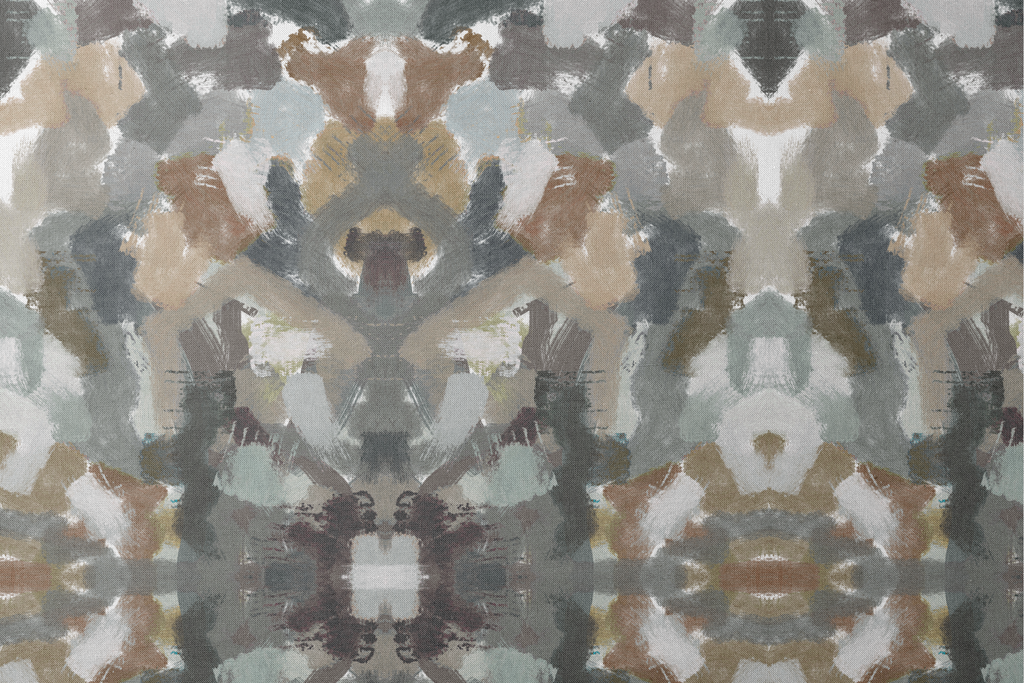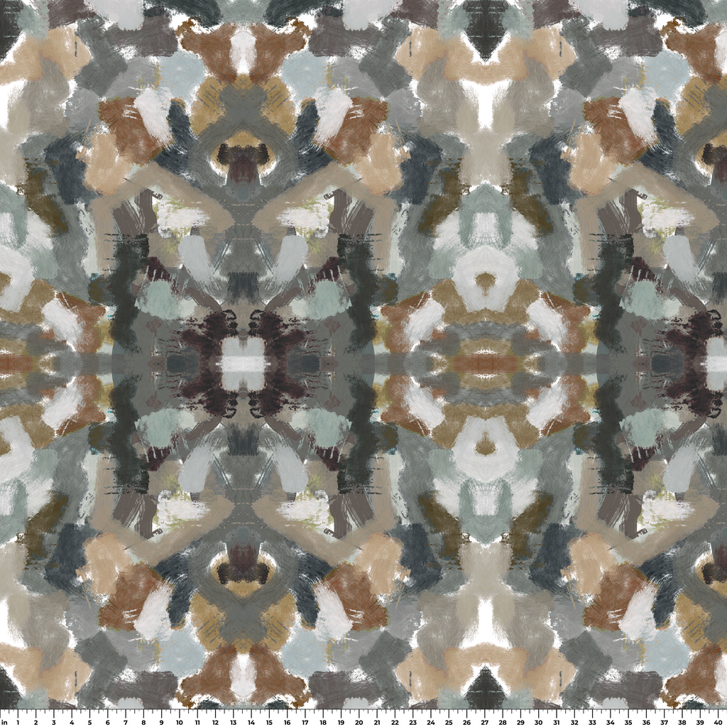 Abstract kaleidoscope-like pattern in brown, grey, and cream featuring geometric shapes and flowing organic forms. Perfect for any modern home with a contemporary artistic flair.