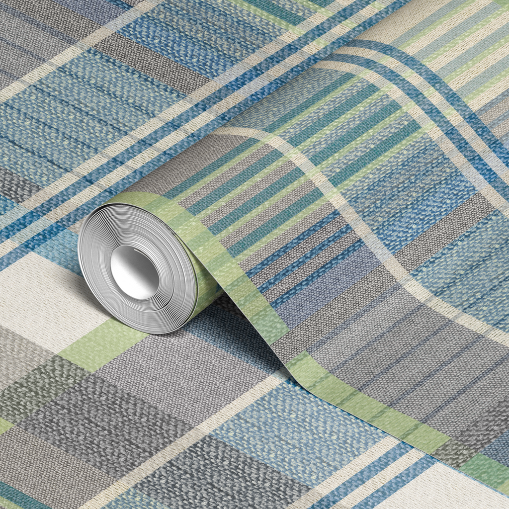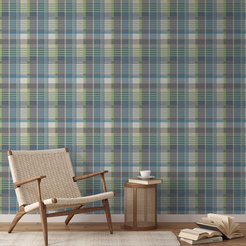 Classic plaid pattern in cool tones featuring blue, green, and gray stripes.