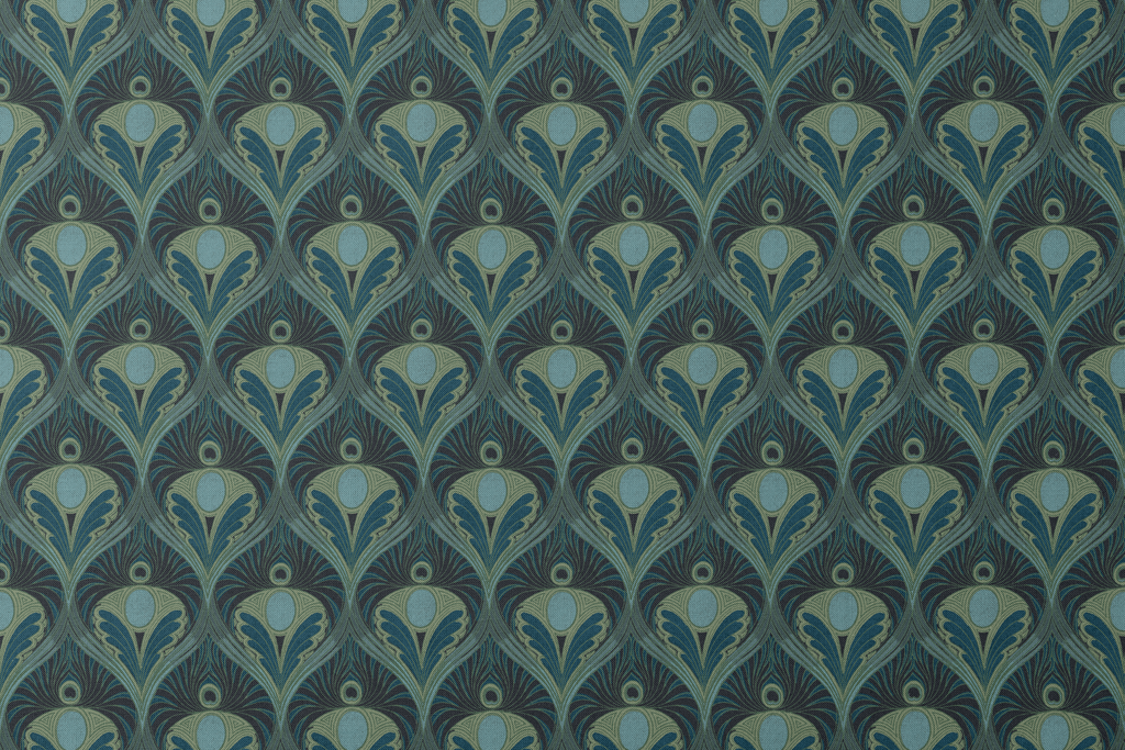 Elegante patrón art nouveau en tonos de verde, azul y turquesa con motivos florales estilizados y formas curvas que crean un efecto visual de plumas o abanicos repetidos.