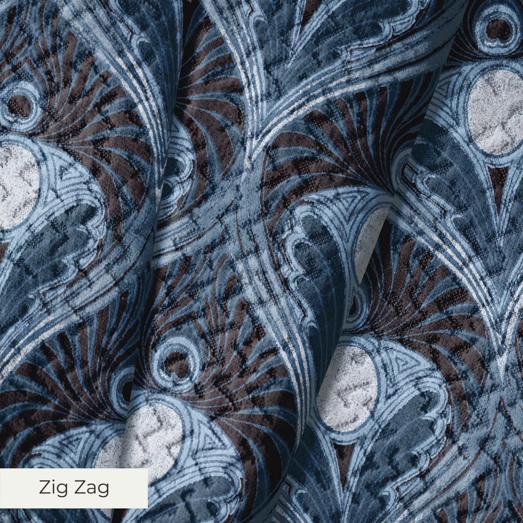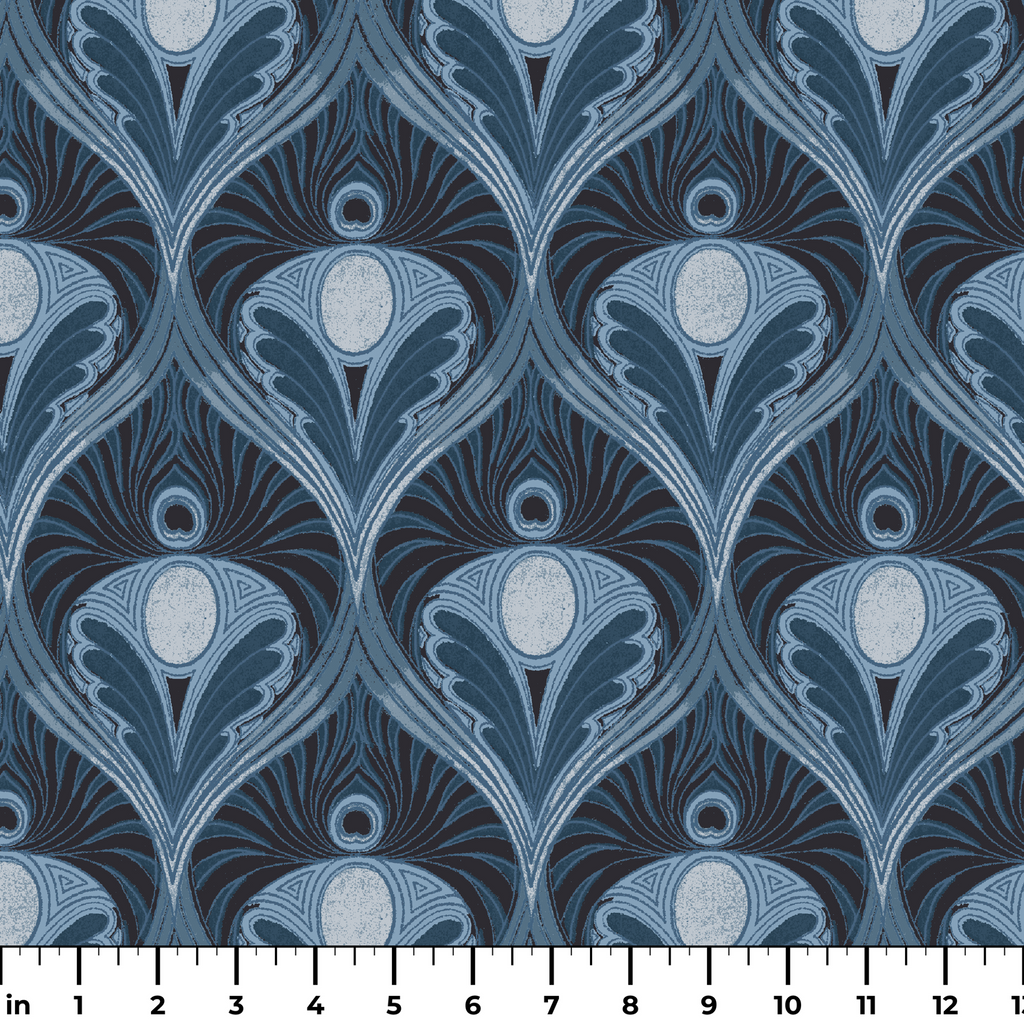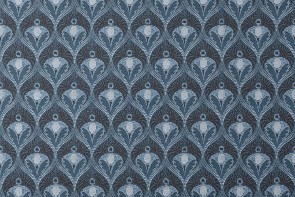 Elegante estampado Art Nouveau en tonalidades de azul que presenta un diseño repetitivo de plumas estilizadas, creando un patrón sofisticado y atemporal perfecto para decoración interior.