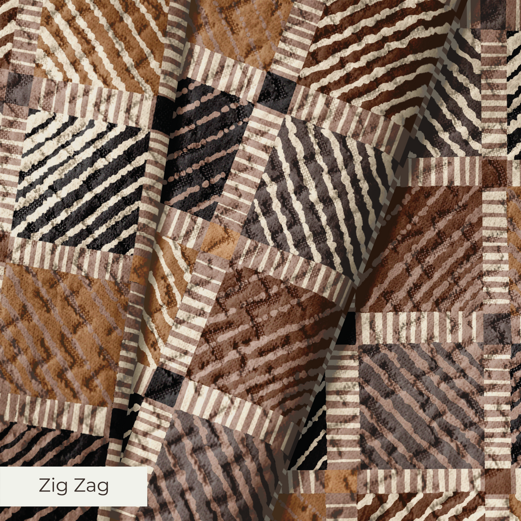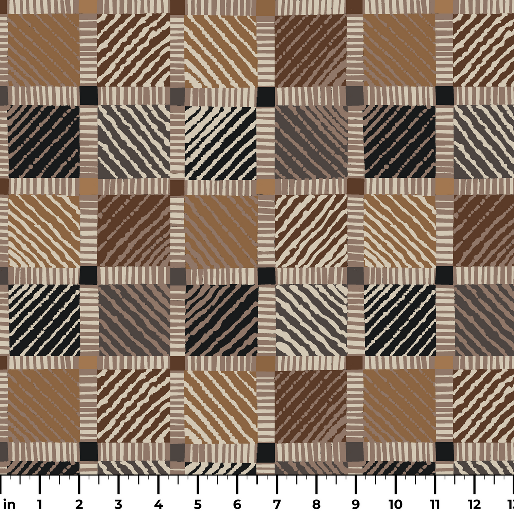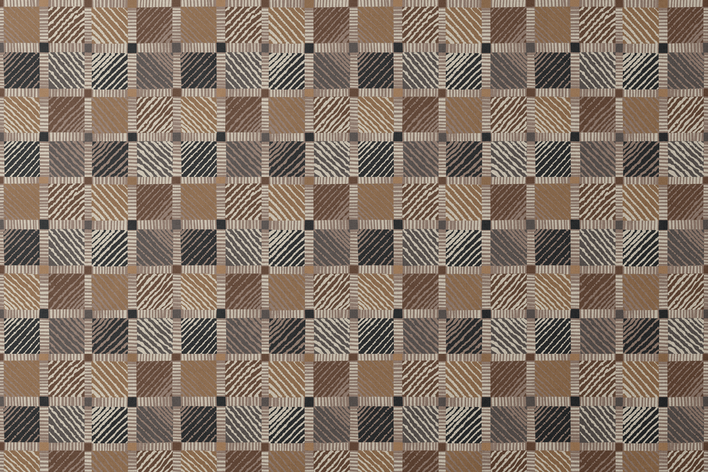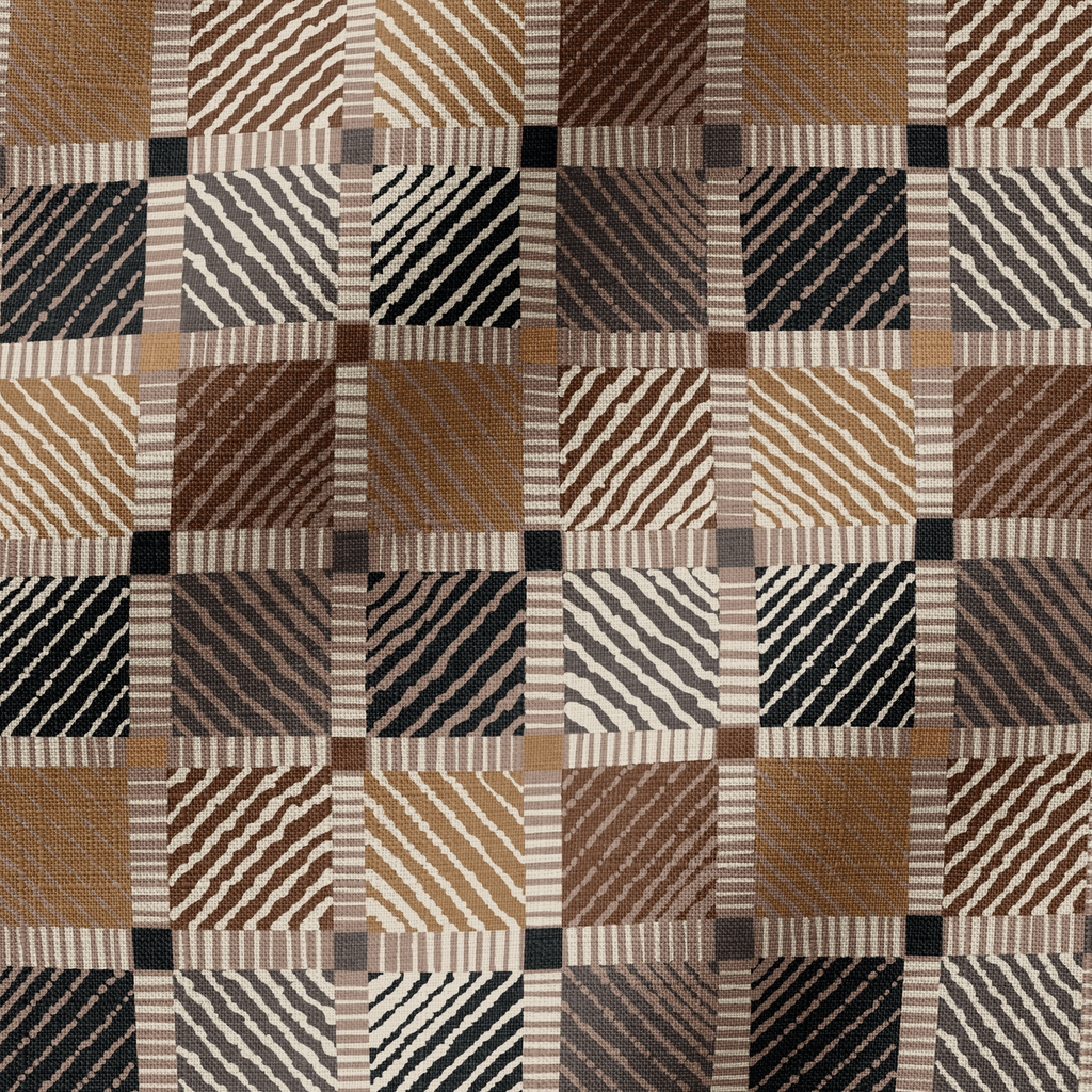 Geometric patterned design featuring alternating squares in neutral beige, black, and brown tones with diagonal striped textures, creating a contemporary checkerboard effect perfect for modern home decor.