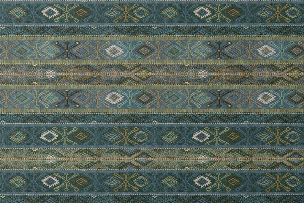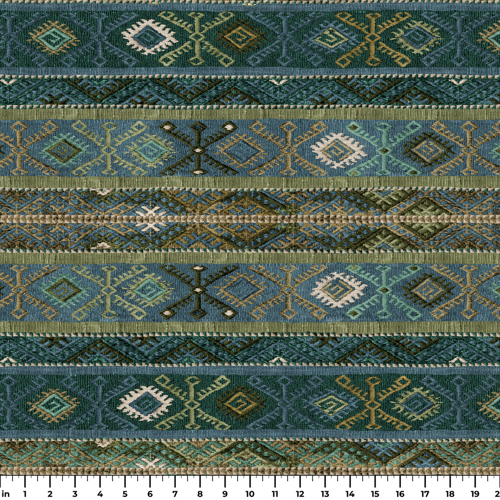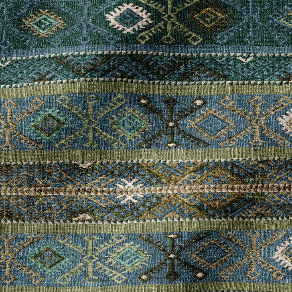 Rich teal and golden geometric tribal pattern featuring traditional diamond motifs and intricate borders. Perfect for bohemian home decor or global-inspired upholstery projects.