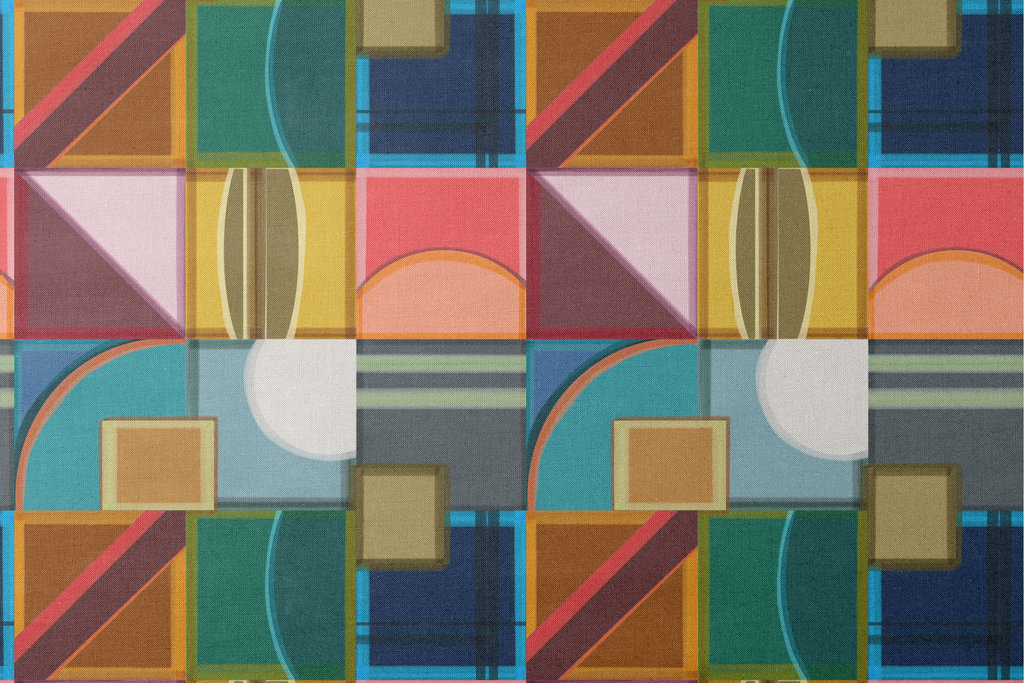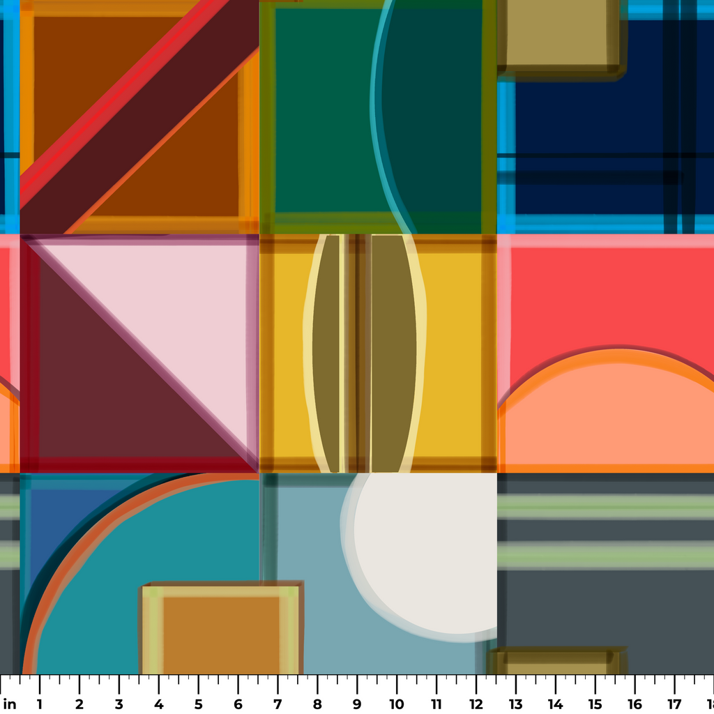 Contemporary geometric pattern featuring overlapping squares, circles and triangles in a sophisticated palette of bold red, blue, green and brown, perfect for modern home decor.