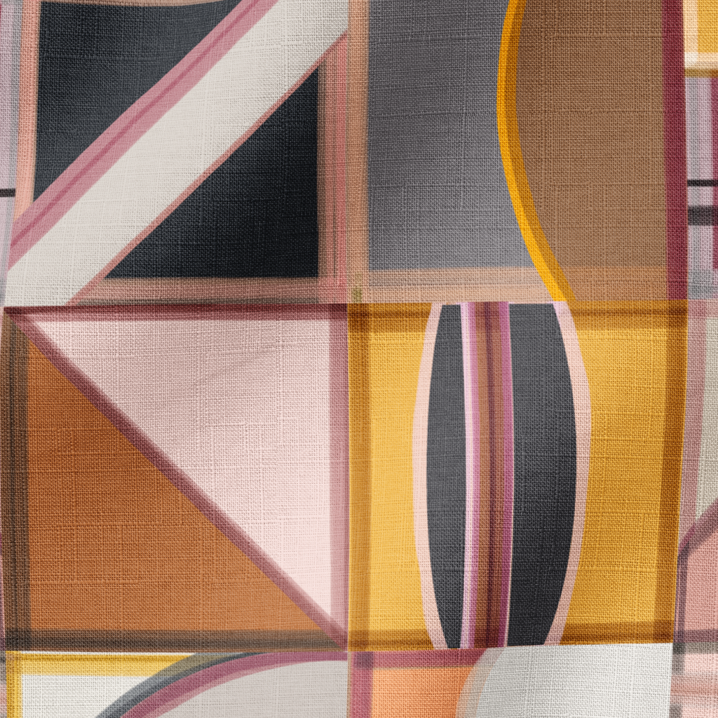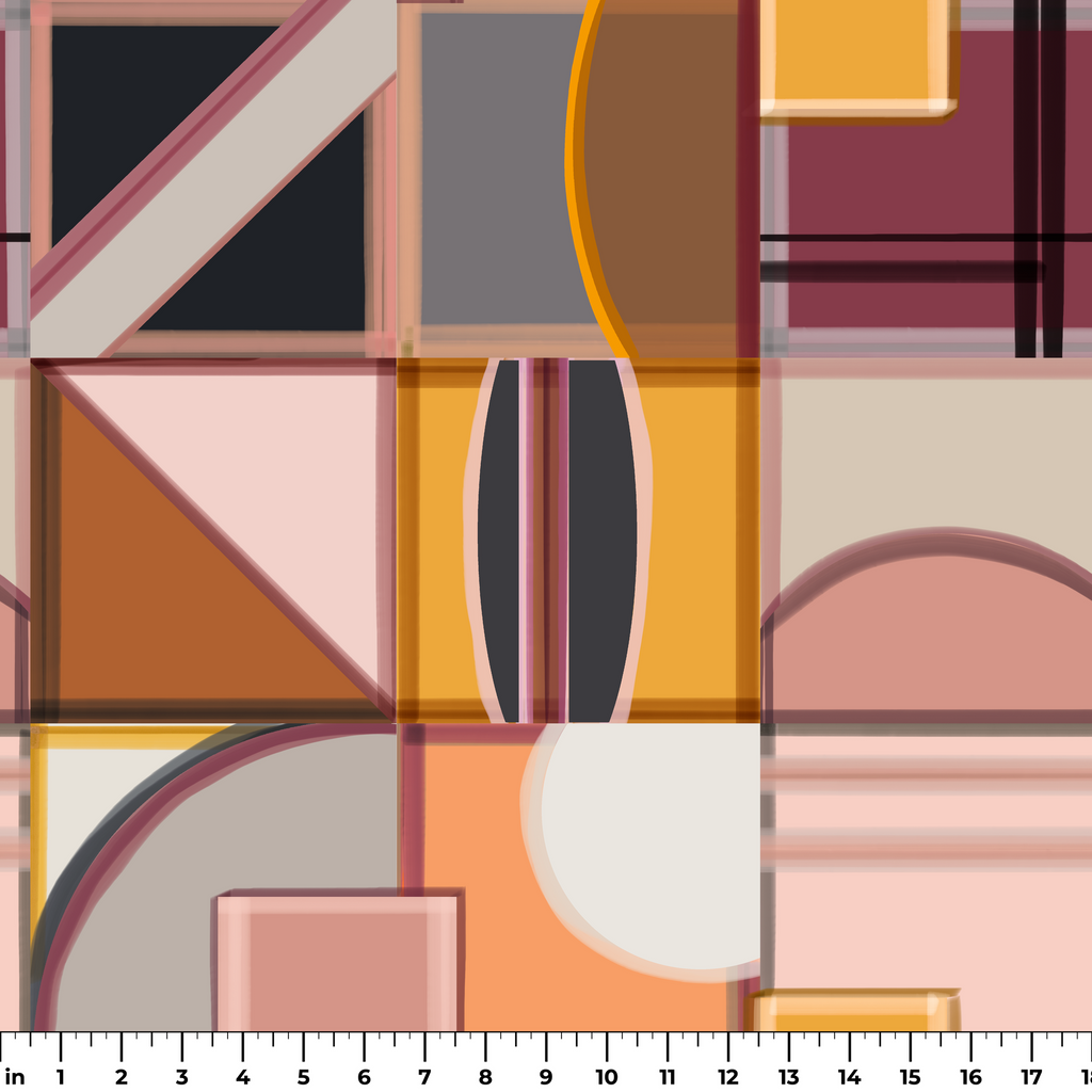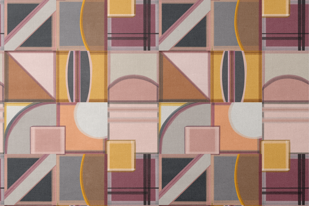 Contemporary geometric pattern featuring overlapping squares, circles and triangles in a sophisticated palette of mauves, terracottas, beige and black, perfect for modern home decor.