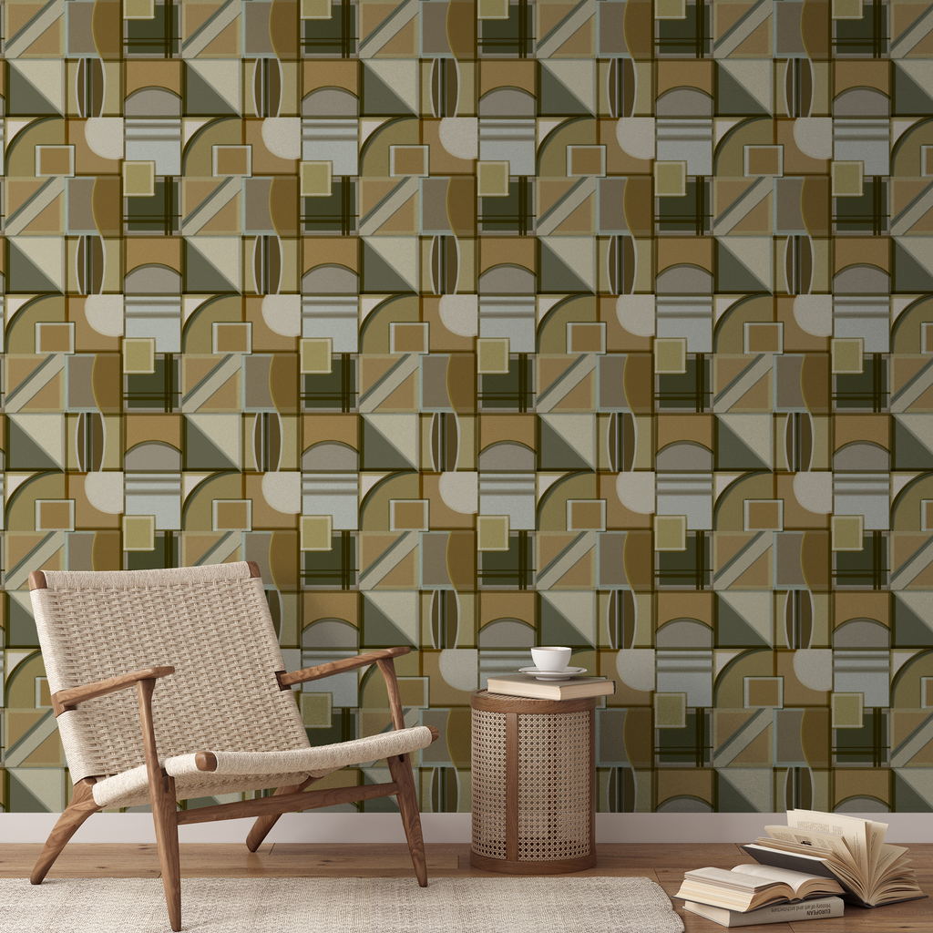 Sophisticated contemporary geometric design featuring overlapping squares, circles, and triangles for a serene mid-century modern aesthetic.