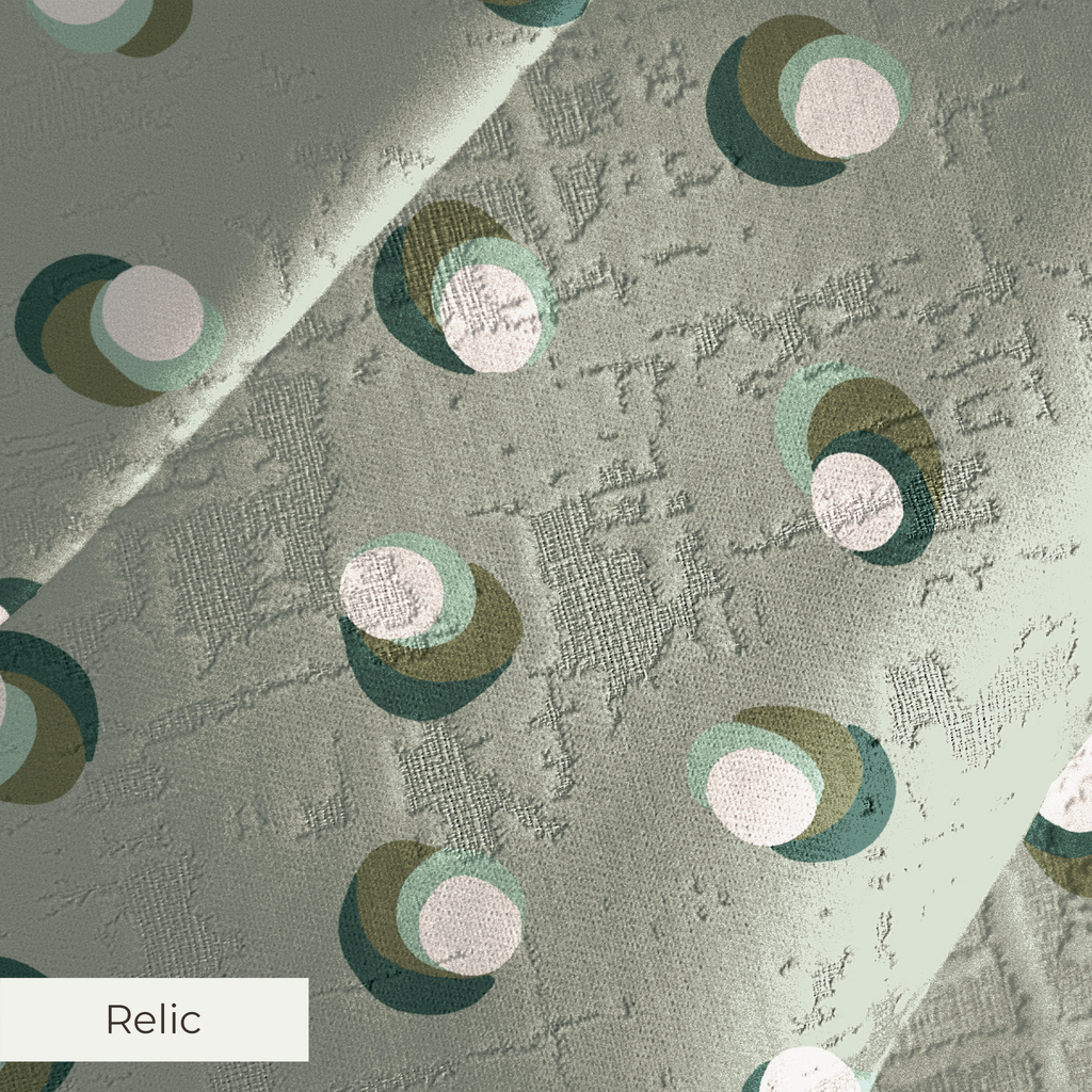 A luxurious jacquard upholstery fabric with an abstract distressed pattern in soft, elegant tones and subtle sheen. Relic brings timeless sophistication and versatile styling across traditional and contemporary interiors.