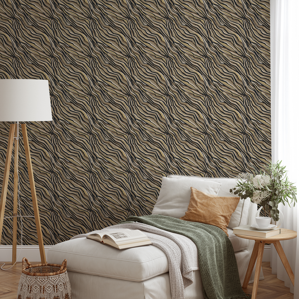 Sophisticated wavy stripe pattern in rich black, cream, and beige hues. Modern design with flowing organic lines creates an elegant abstract aesthetic perfect for contemporary home decor.