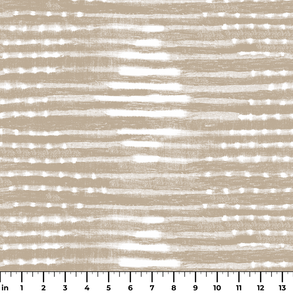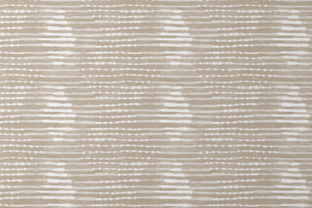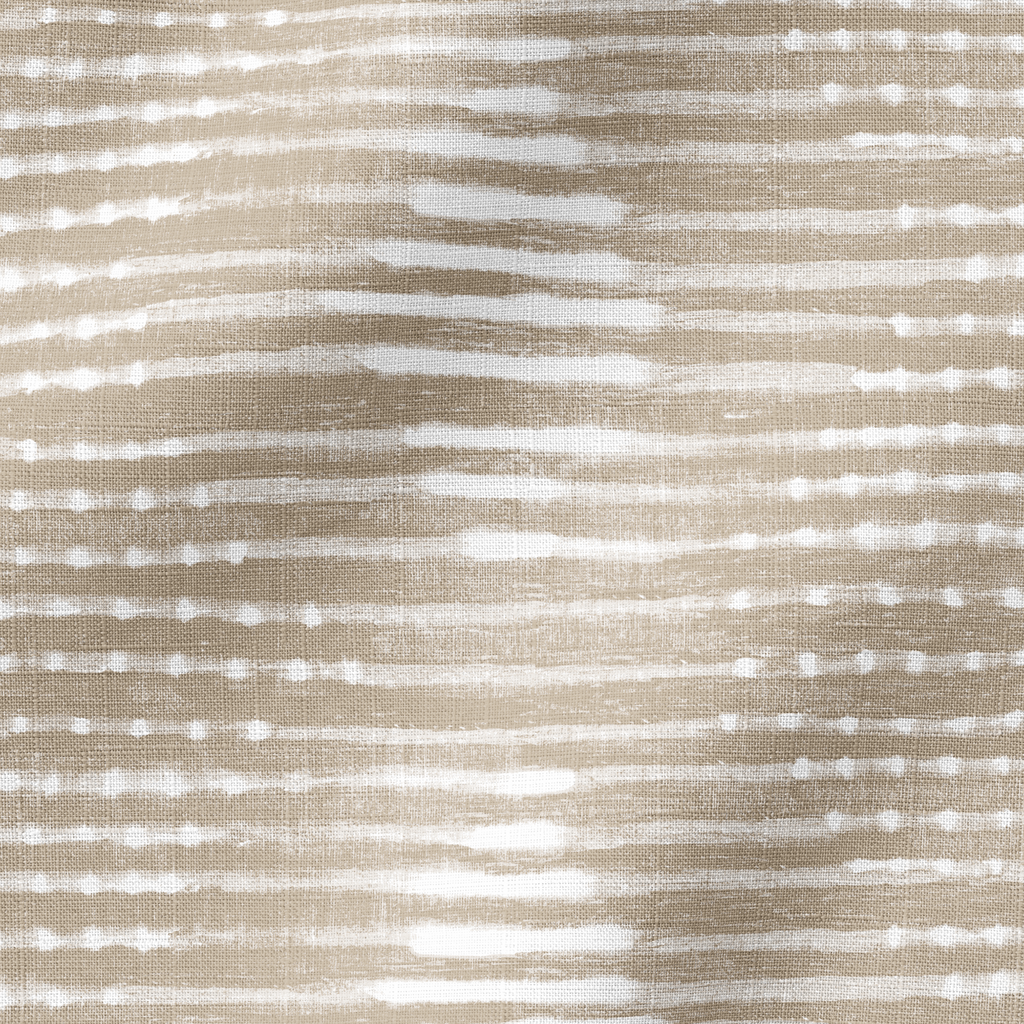 Elegante diseño textil de rayas horizontales en tonos neutros de beige y blanco, creando un sutil patrón con efecto tie-dye perfecto para decoración de interiores contemporánea.