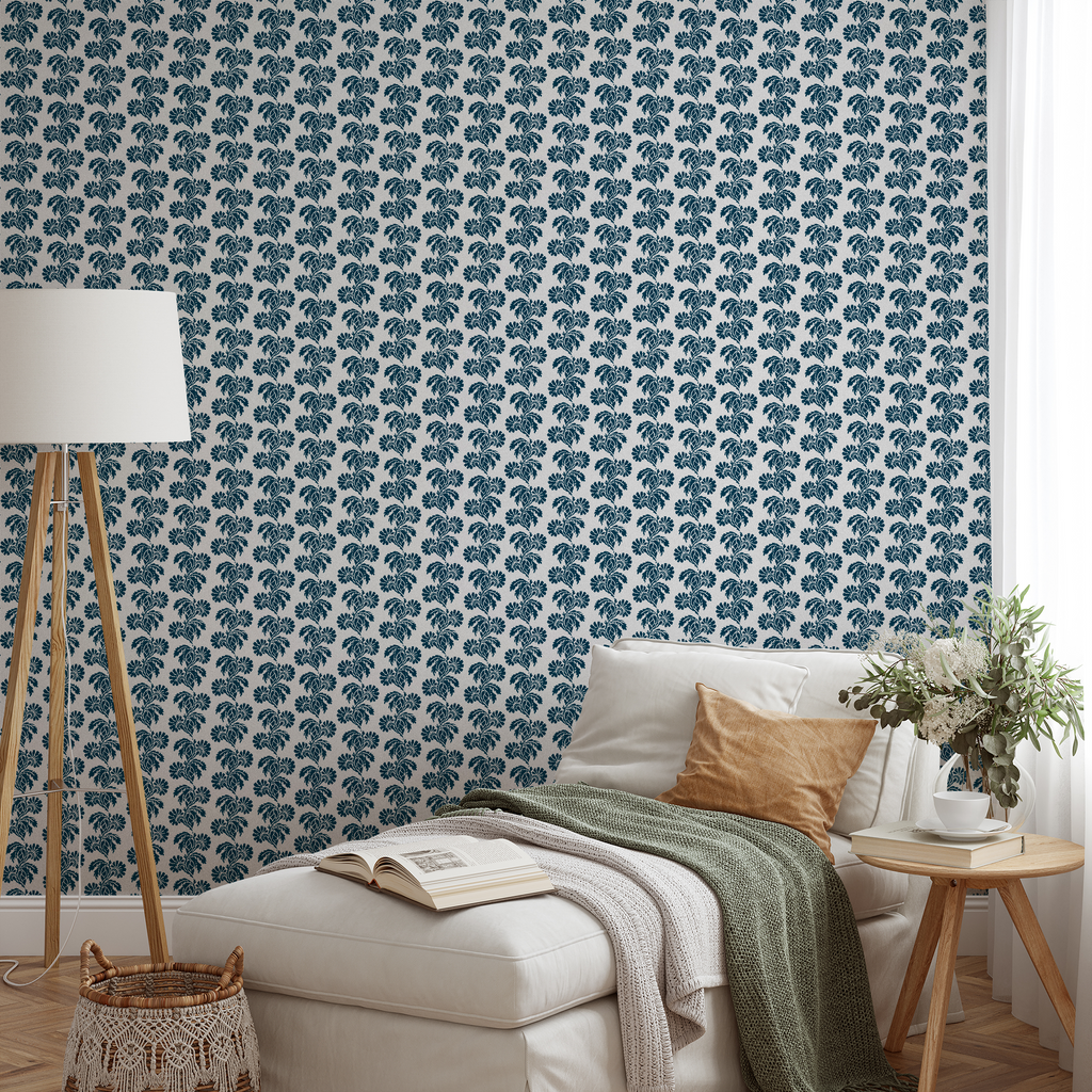 Elegant damask-inspired floral pattern in blue, featuring traditional botanical motifs arranged in a repeating vertical layout. Perfect for heritage-style rooms.