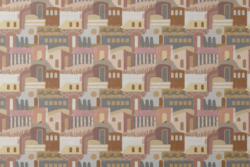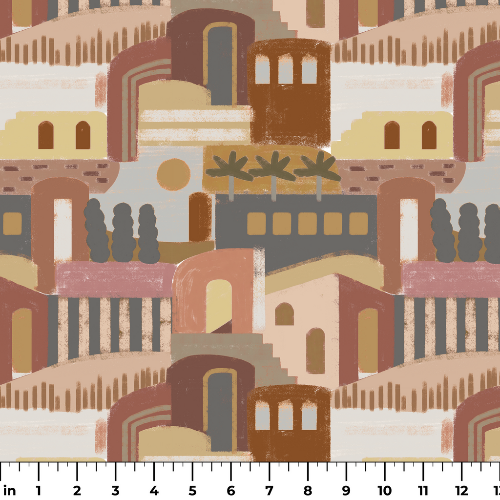 Abstract architectural collage in warm earth tones, featuring geometric shapes and Middle Eastern-inspired structures with arched doorways and stylized buildings.