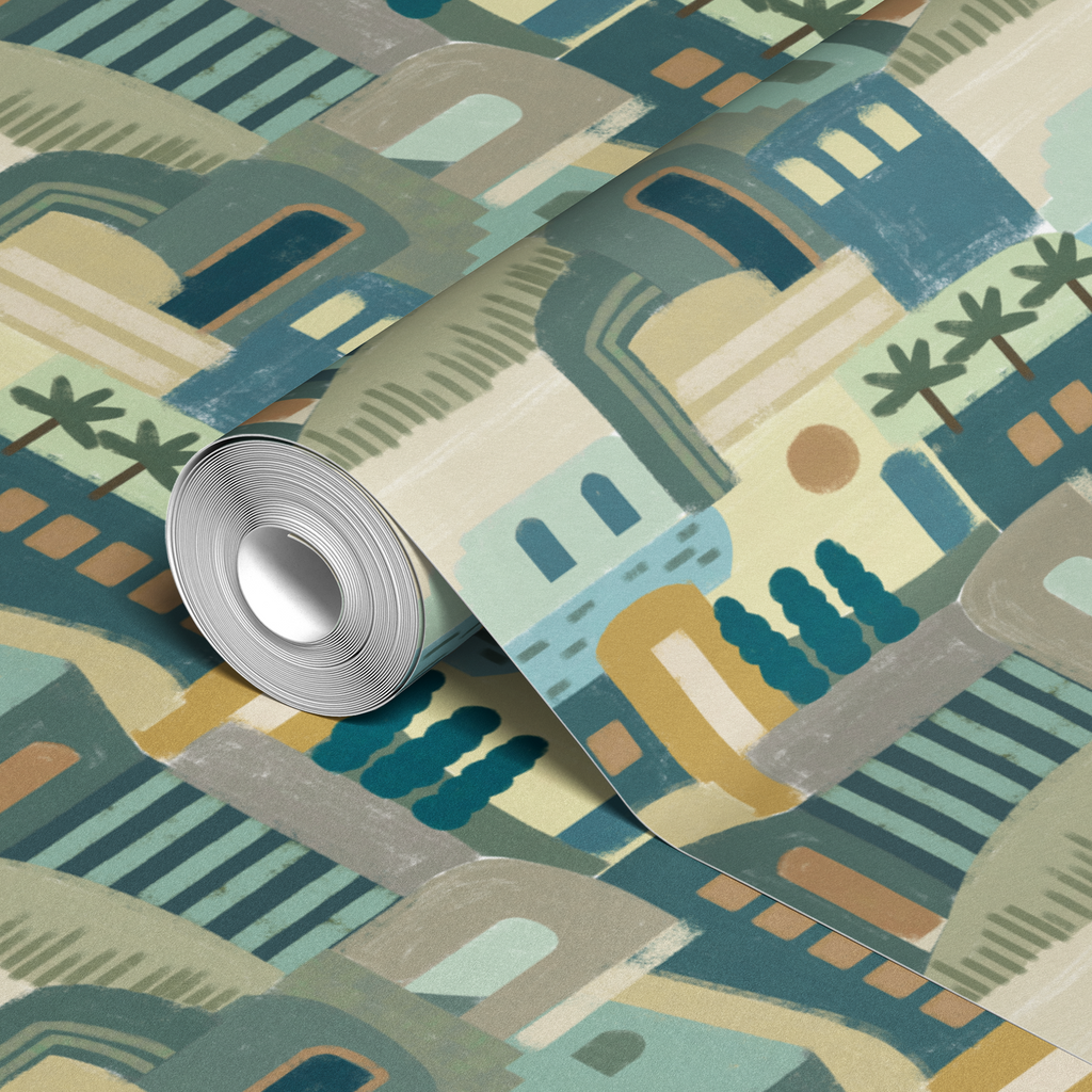 Abstract architectural collage in cool blue and green tones, featuring geometric shapes and Middle Eastern-inspired structures with arched doorways and stylized buildings.