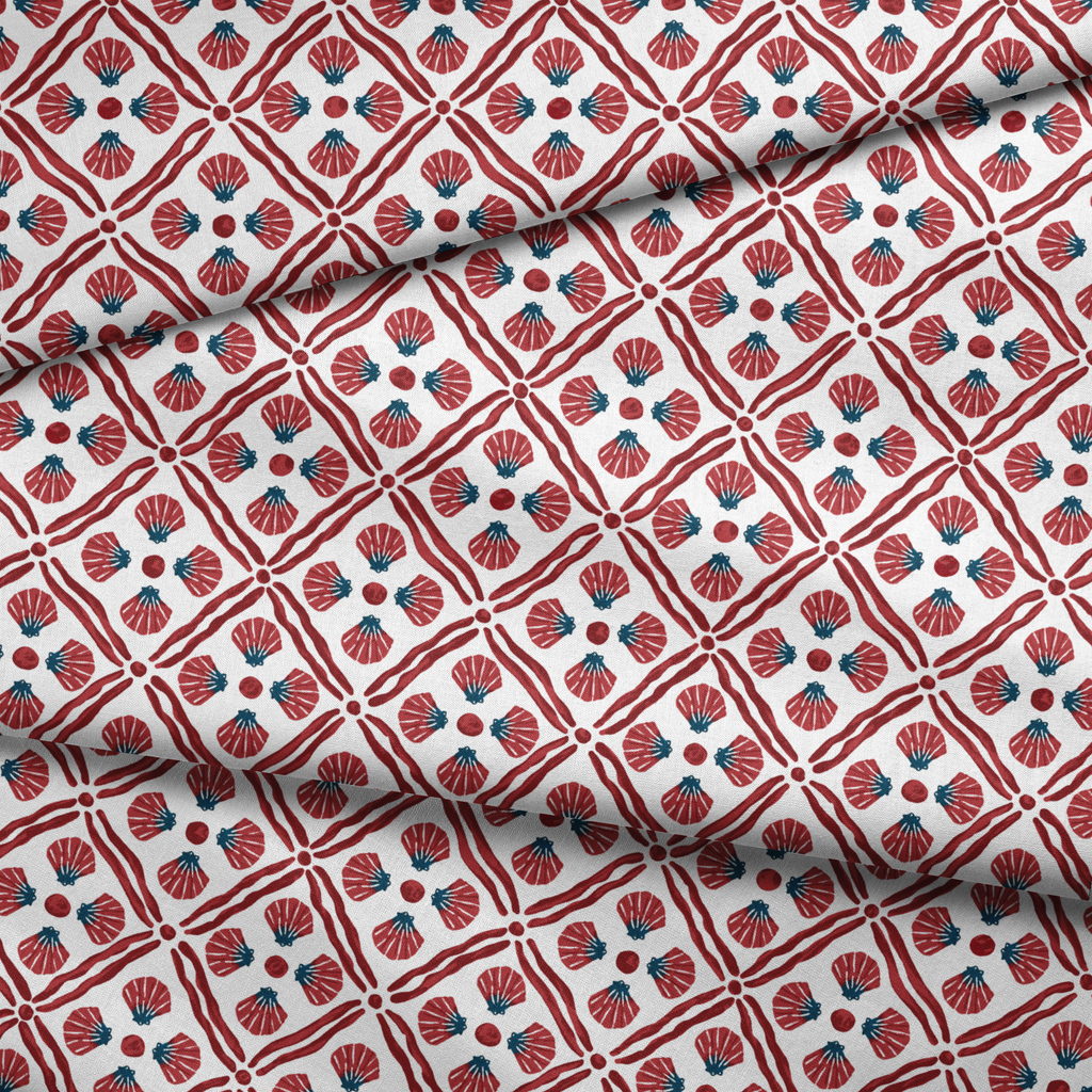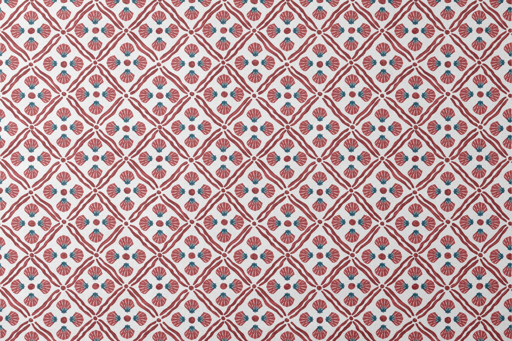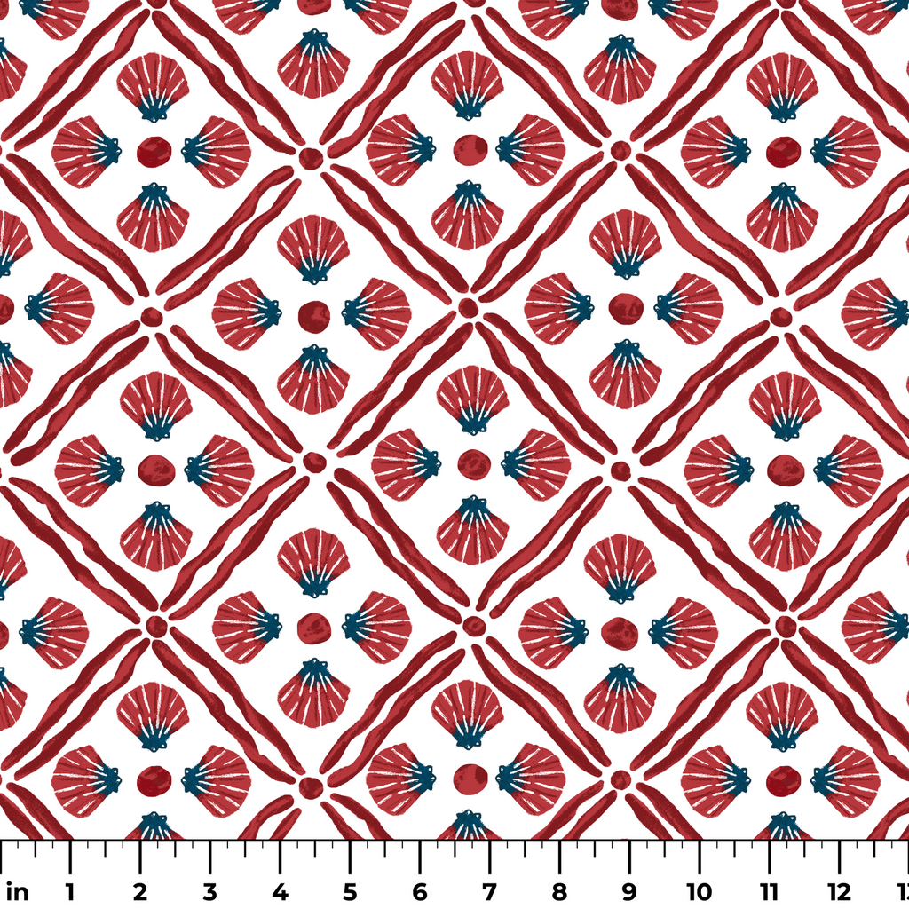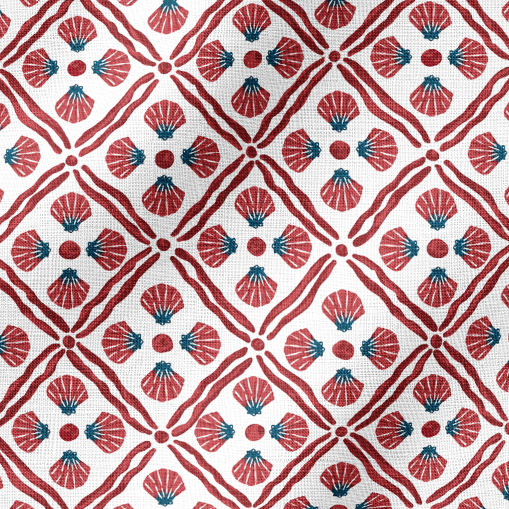 Elegantly traditional coastal pattern in red with sea shells in a diamond layout, creating a perfect beach feel for any space.