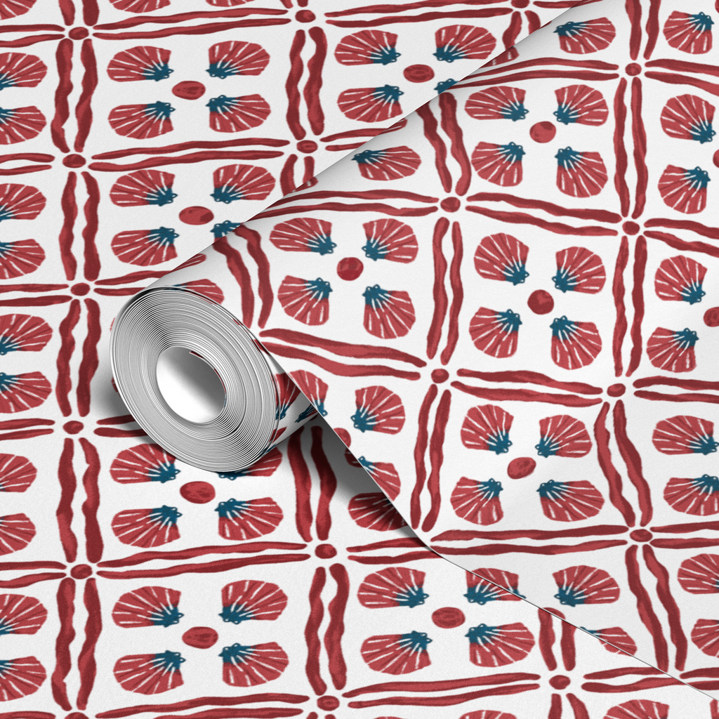 Elegantly traditional coastal pattern in red with sea shells in a diamond layout, creating a perfect beach feel for any space.