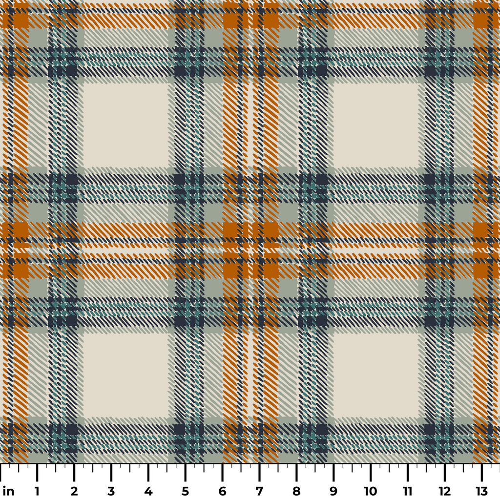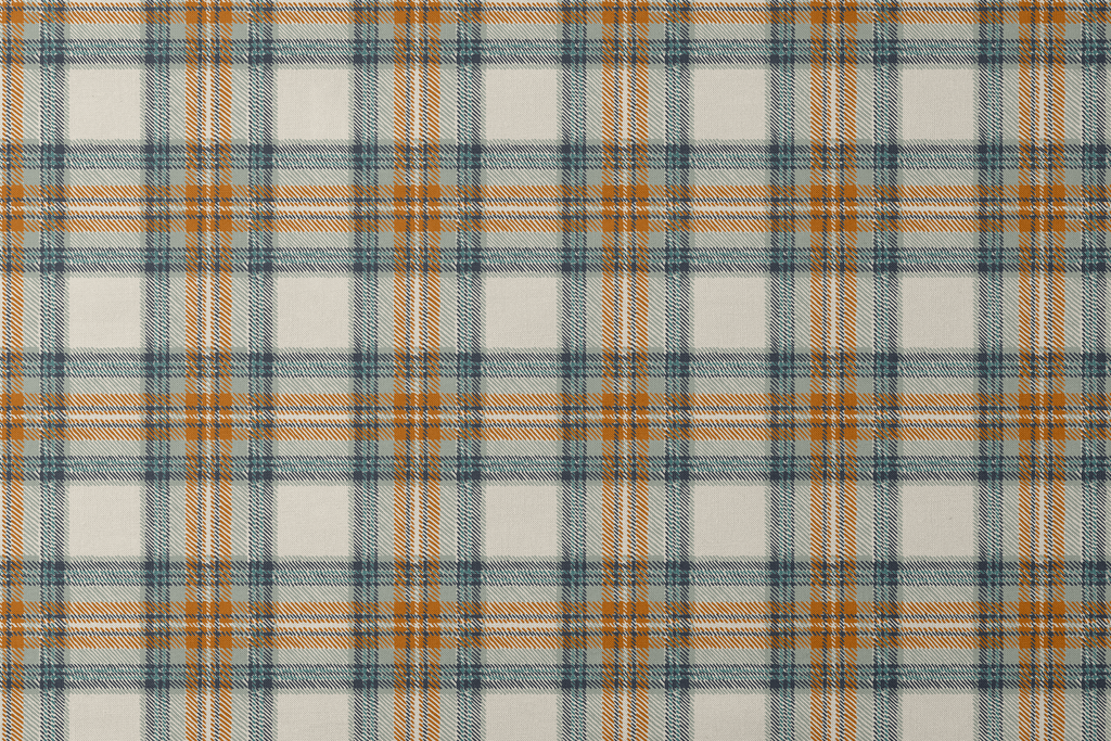 Classic plaid pattern in warm orange and navy blue tones, featuring a traditional tartan design with a cream background and textured weave appearance.