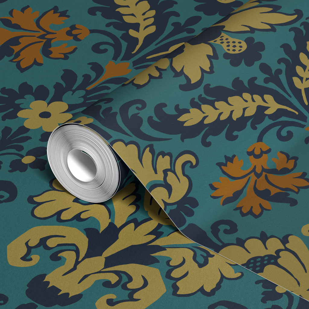 Exquisite damask floral design features ornate scrolls and botanical elements in a traditional heritage style with sophisticated Victorian design influences.