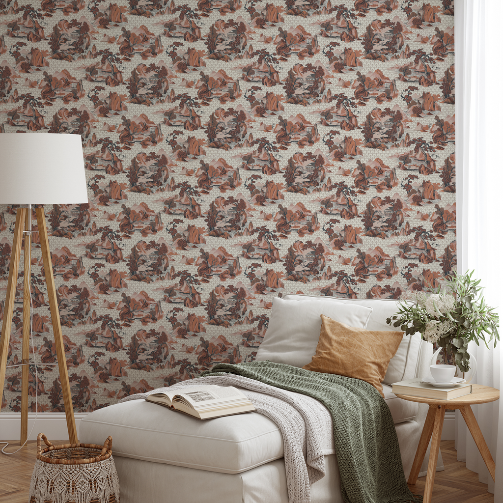 This elegant Asian-inspired pattern features traditional mountain landscapes. The heritage design showcases scenic natural elements with a timeless cultural aesthetic.